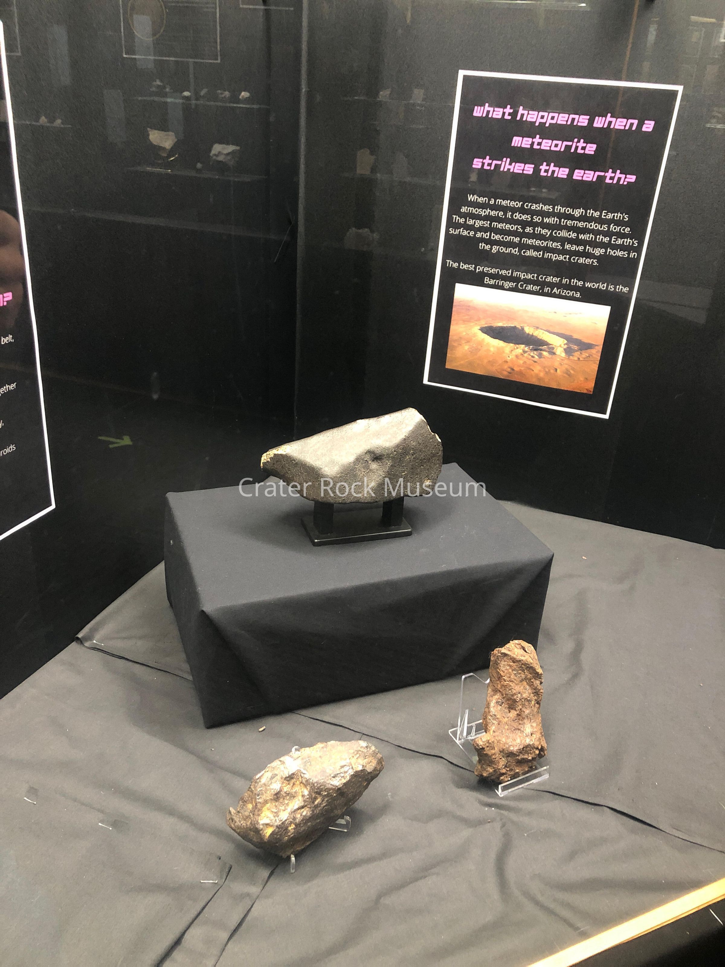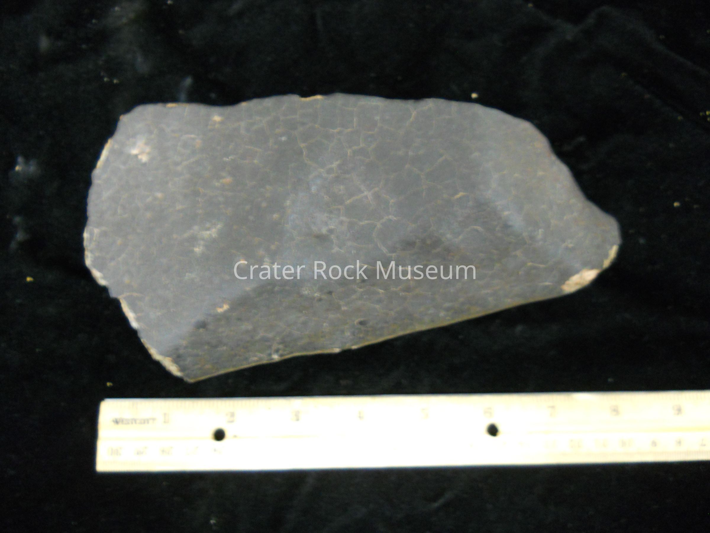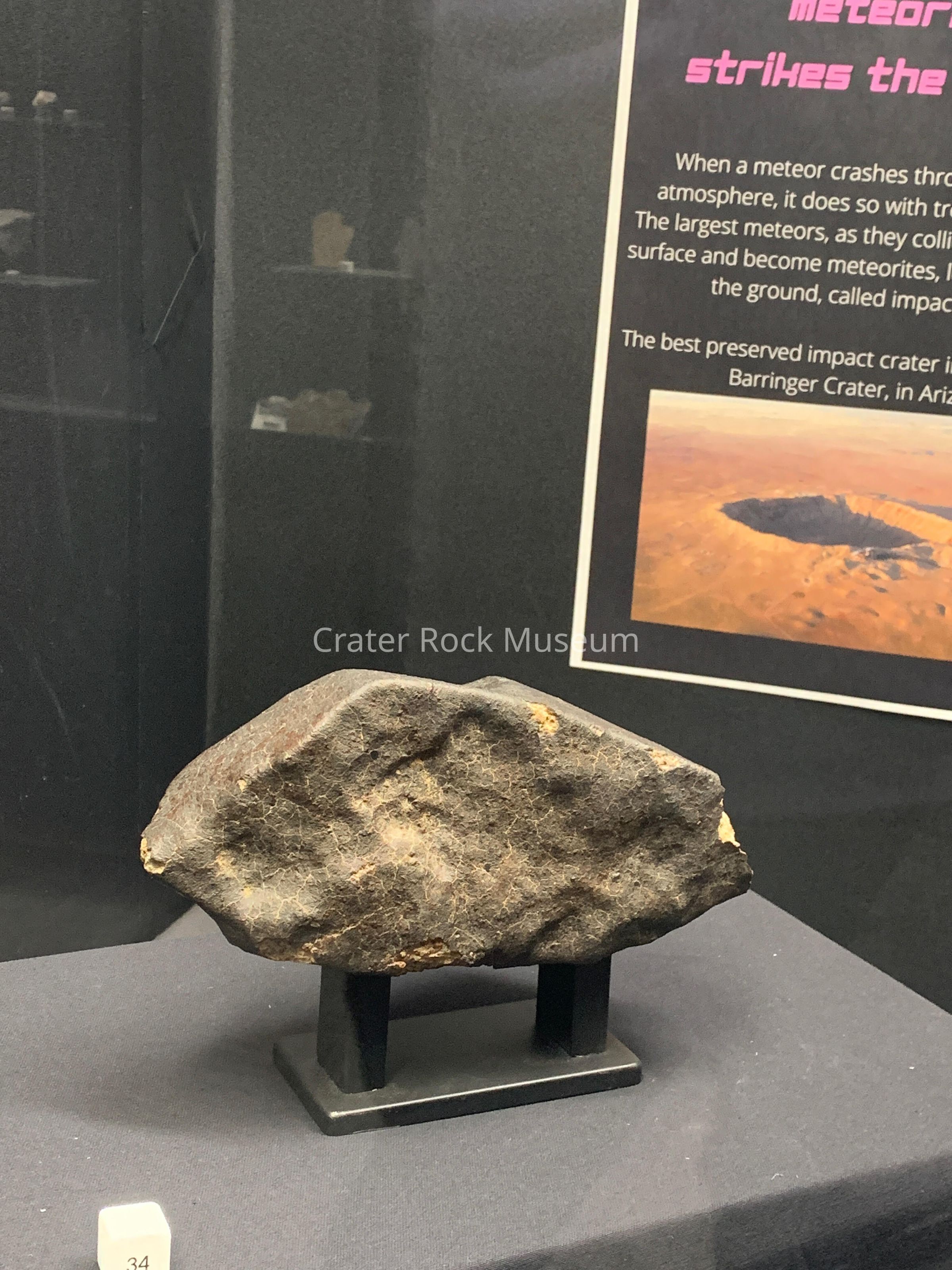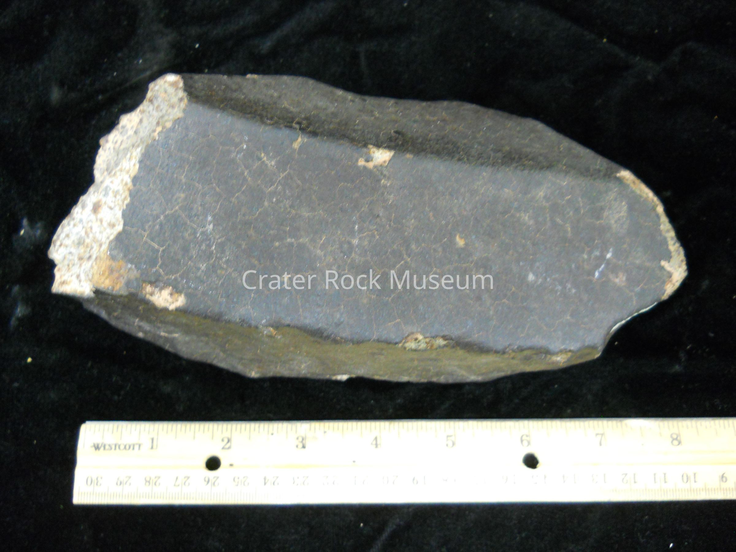 Description: This is a fairly large meteorite with a dark (melted) crust and visible stony material inside. It also has an orientation of trajectory.