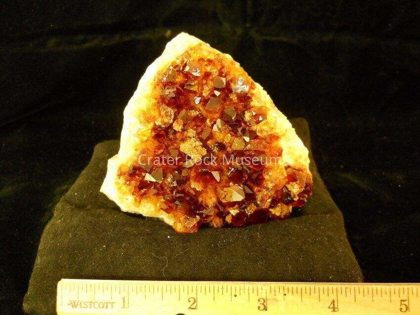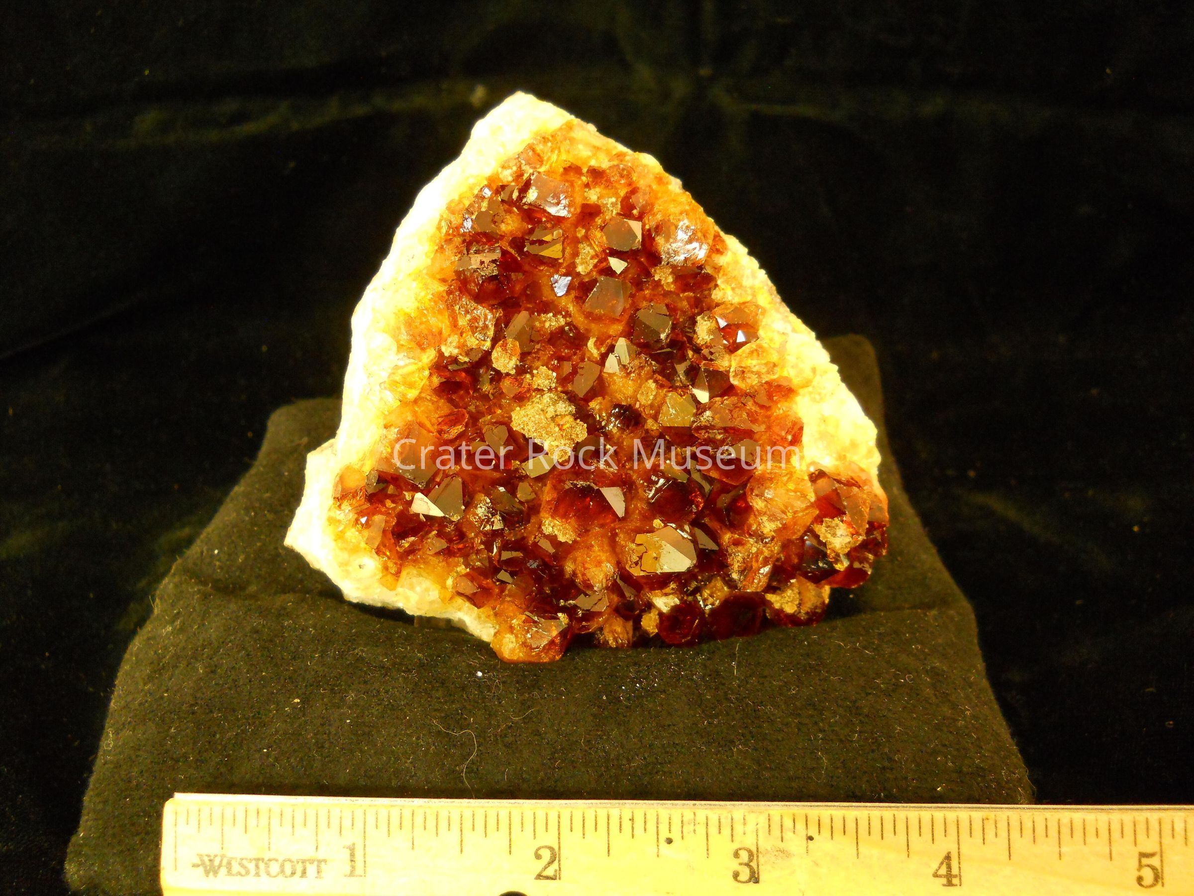 Description: This is a small cluster of a mass of distinct crystals. The color is dark orange with a white crysstal matrix.