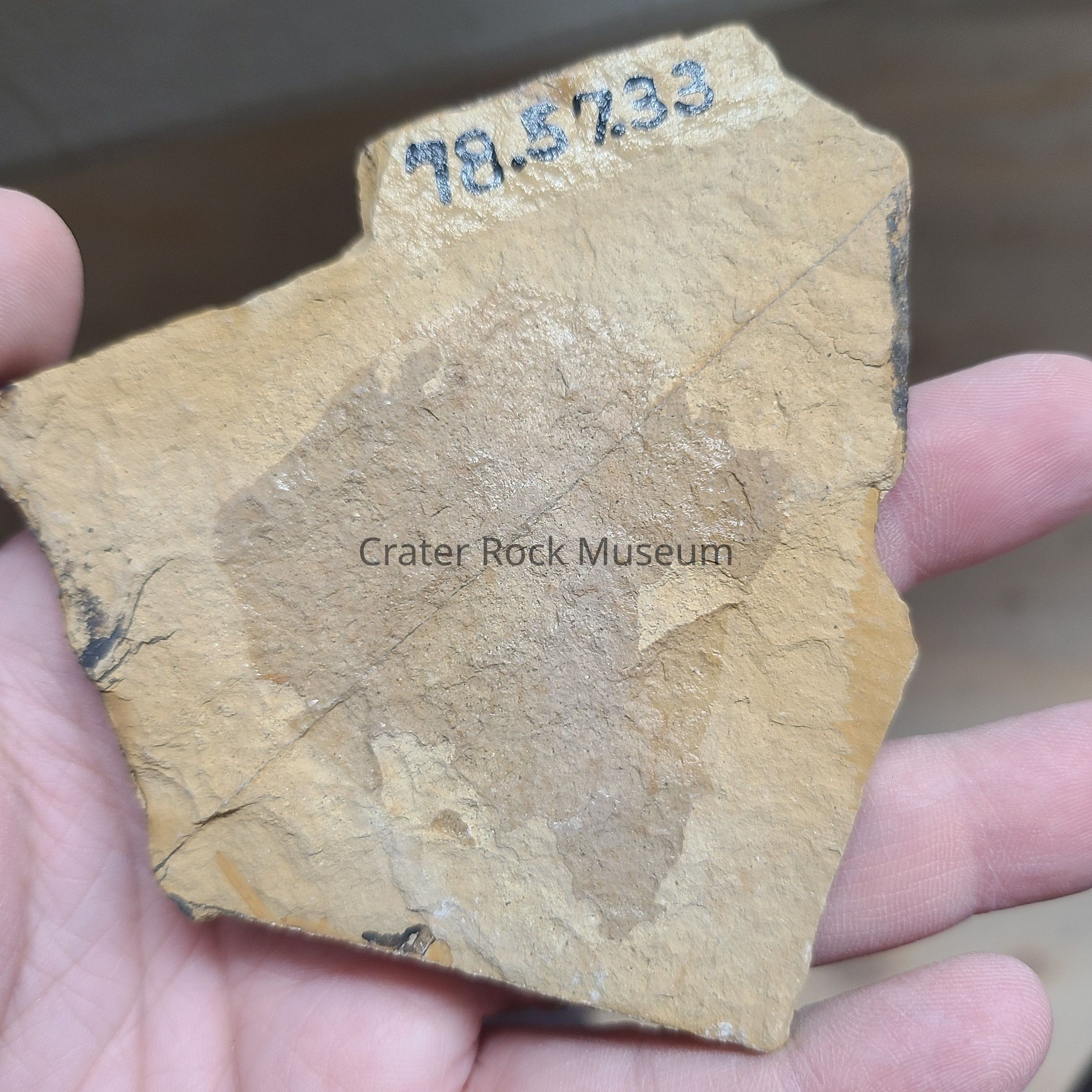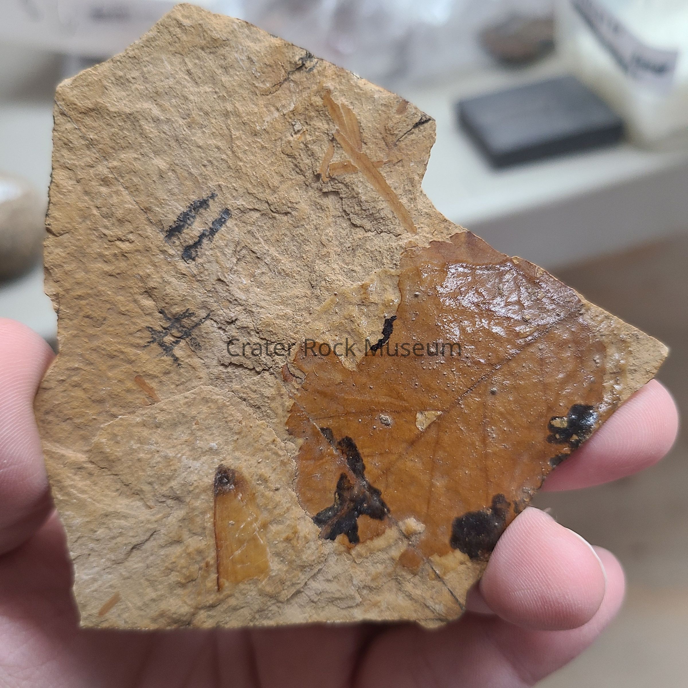 Varnished leaf impression, golden brown colored, shiny, 2" long, from Eagle Point, OR.
