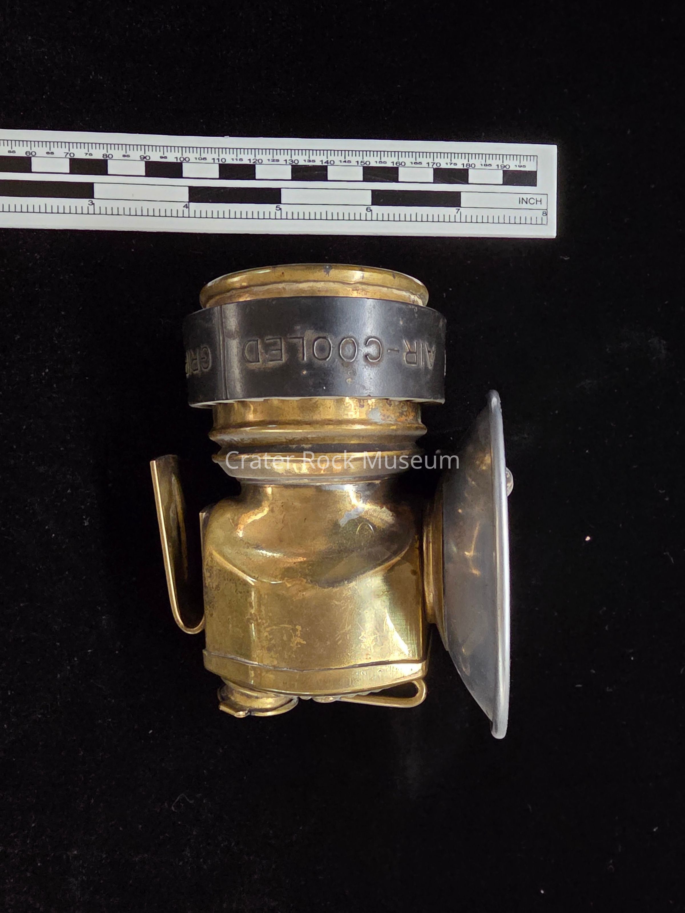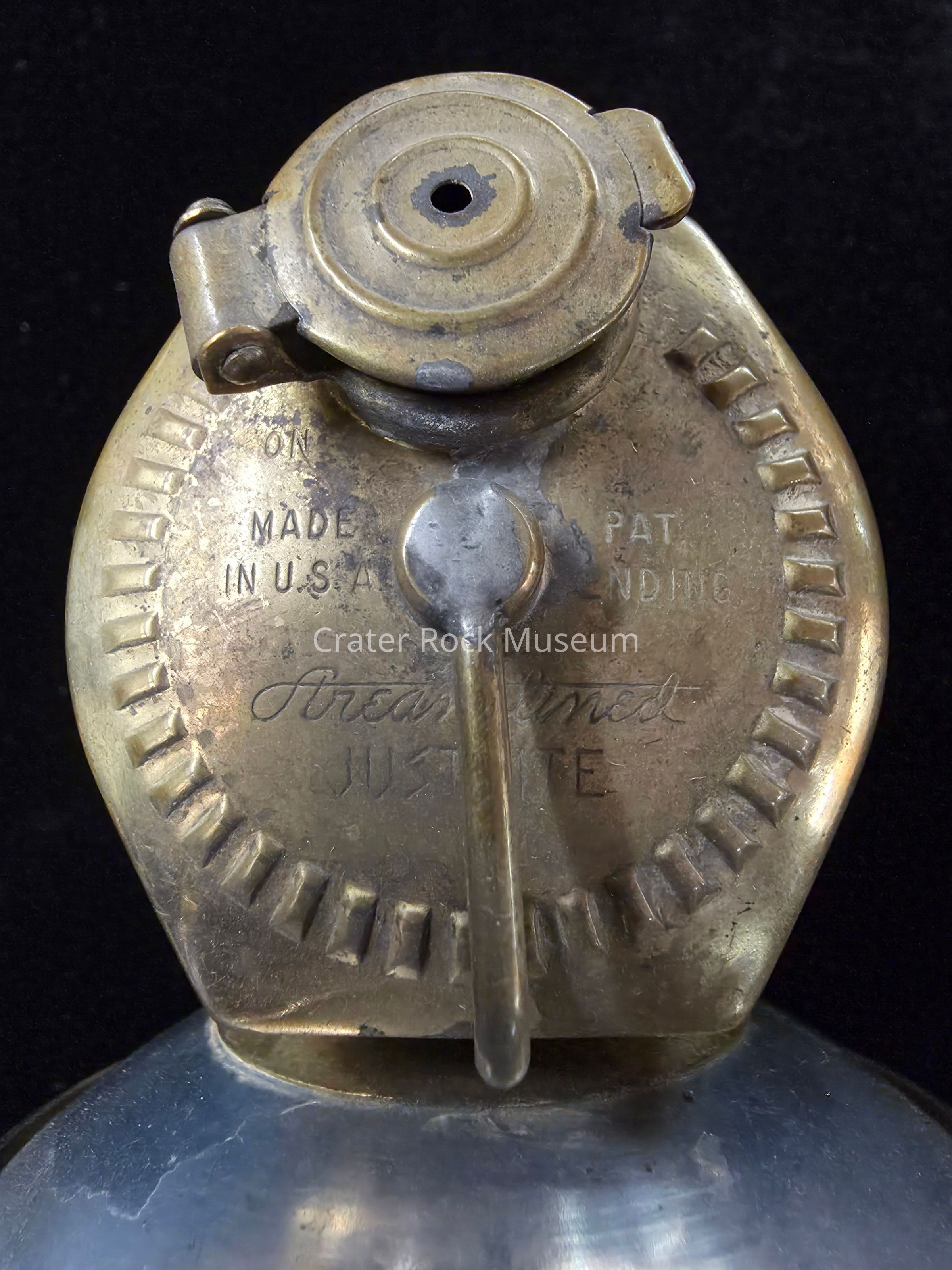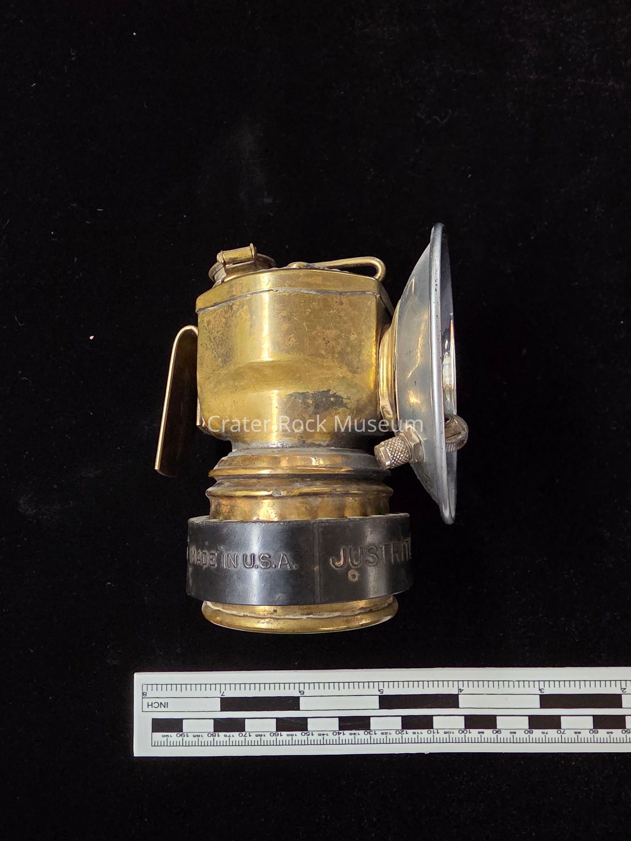Description: This artifact is a "Just Rite" brand, small copper miners lamp. It is in excellent condition and functional.