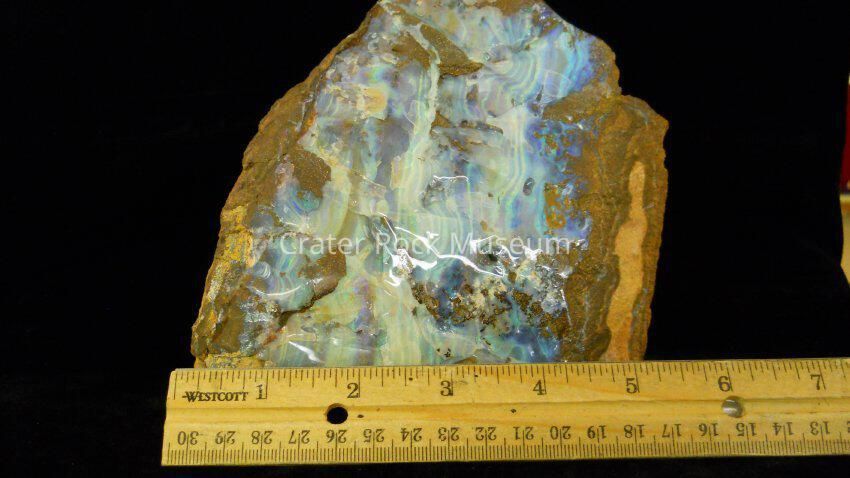 Description: Matrix is multi-reddish with various dark and light brown. Some pink with white and gray throughout. Face is opalized with different shades of blue.