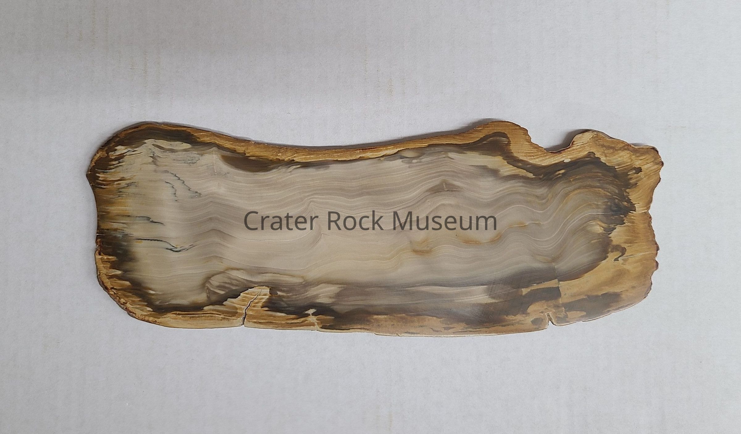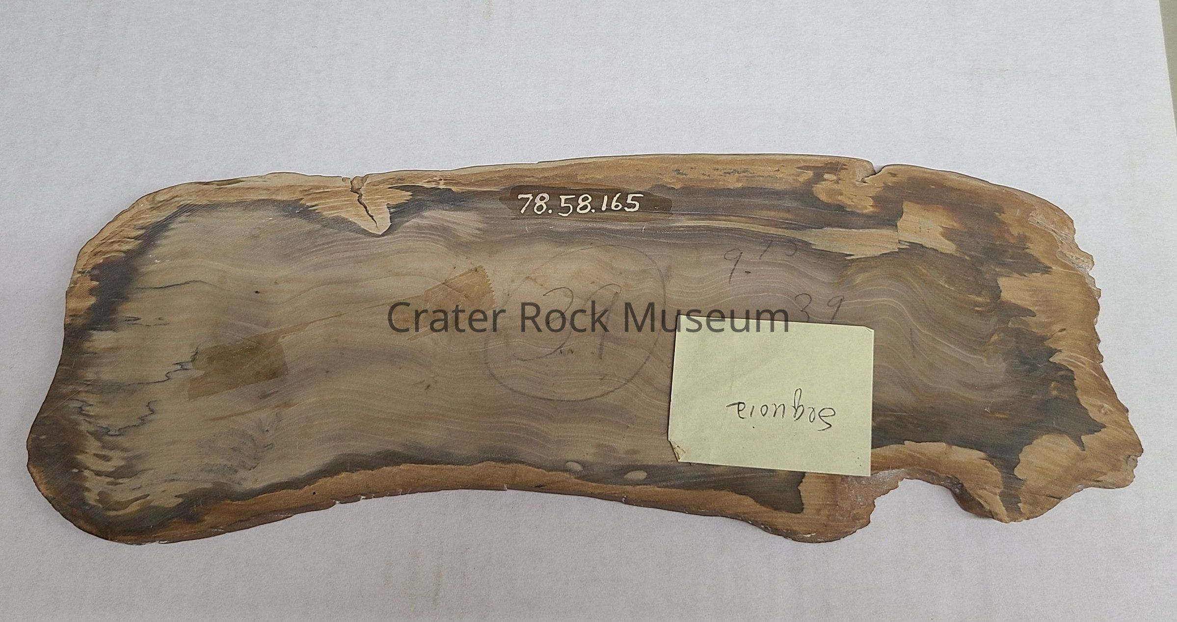 Roughly 11" long slab of petrified wood. Reverse side identifies it as 'Sequoia'Other Names and Numbers