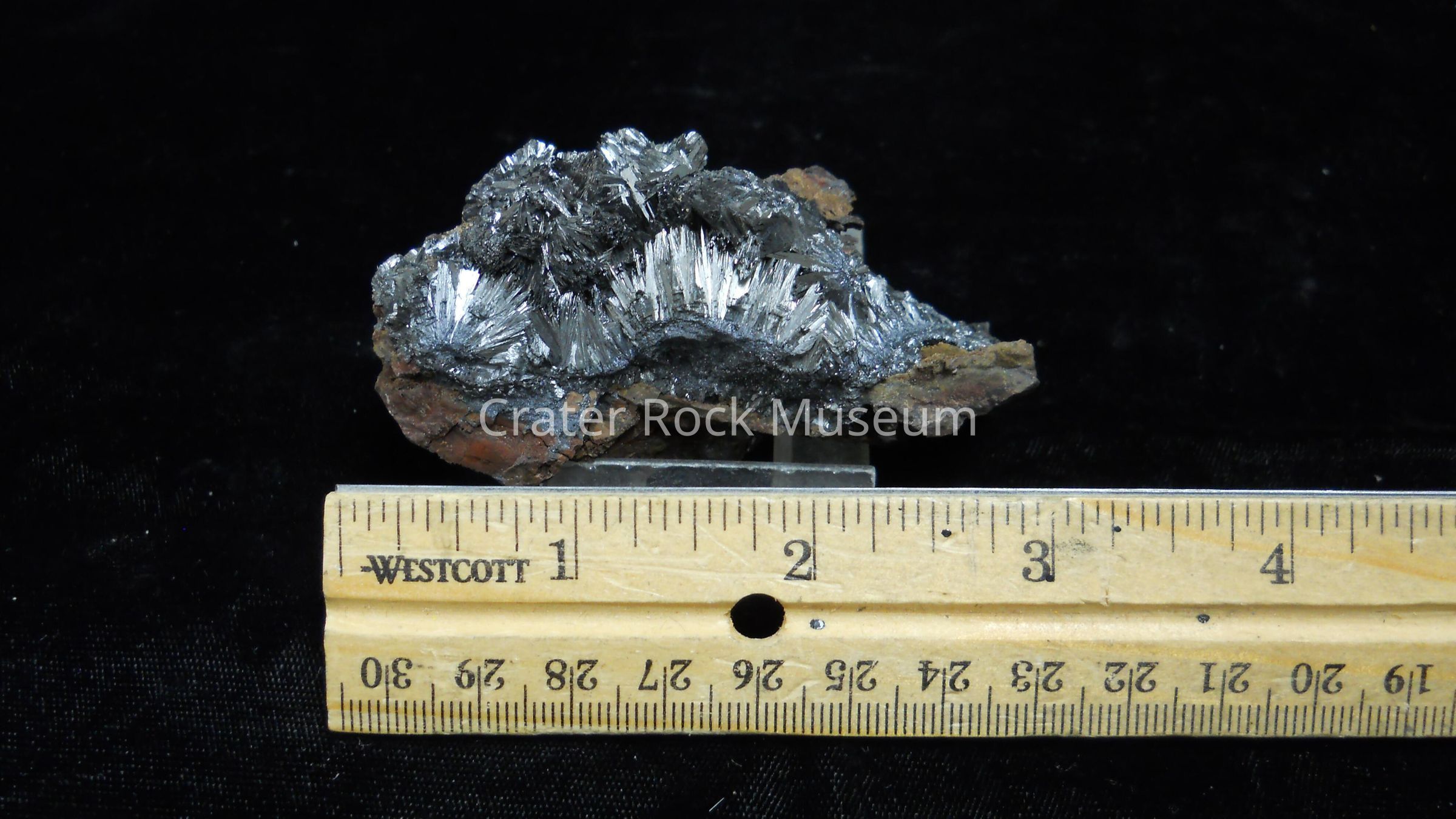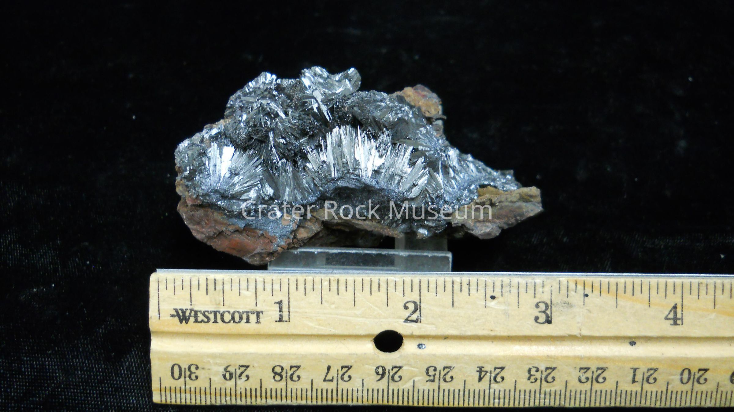 Description: Small specimen with a reddish-brown matrix and metallic radial crystalline formations throughout.