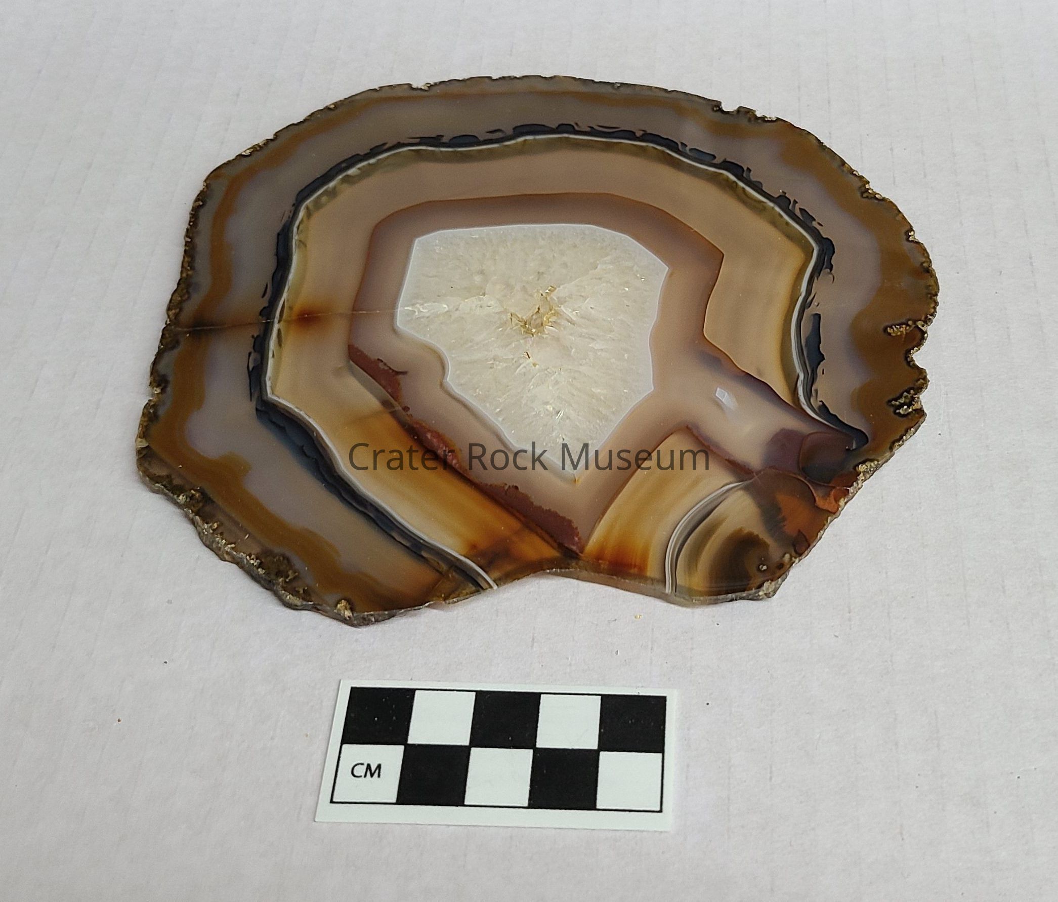 A 1/8" (.2 cm) thick slice of Agate from Brazil. Piece is very transparent in most areas. Crystallized center contains several large crystals. Center is surrounded by a neutral toned semi-transparent fortification band with a Red outline. This band is surrounded by another semi-transparent band in neutral tone graduating to a Blue spotted fortification line to a milky band containing a Brownish Orange line. Infiltration hole is apparent. Piece is fairly round with the exception of a V-Cutout on the side A crack extends from outer edge to center.Dimensions