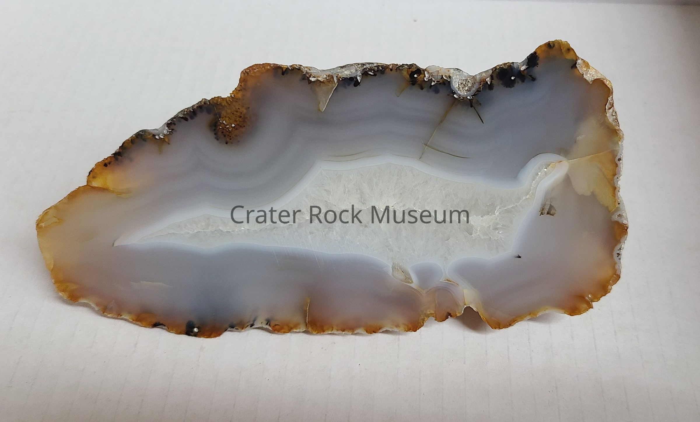 An Agate from Bear Creek, Jackson County, OR. Polished side shows Crystalline center White surrounded by fortified Agate in Light Blue Greys with Orange at edge and some Black Dendrite.Dimensions