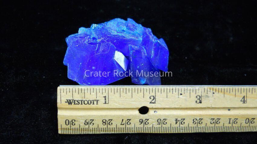 •Color is a bright and deep blue. •Luster is vitreous. •Transparency: Crystals are transparent to translucent. •Crystal System is triclinic; bar 1.•Crystal Habits include rare, individual, natural crystals showing well formed slanted prismatic, tabular or lense-shaped forms, more commonly aggregated into columnar, curved, parallel growth structures. Also found as encrusting, stalactitic and granular masses and as vein filling deposits.•Cleavage is poor (basal). •Fracture is conchoidal. •Hardness is 2.5 •Specific Gravity is approximately 2.2 - 2.3 (noticeably below average). •Streak is pale blue to colorless.•Other Characteristics: Is very soluble in water. A fact that is a detriment to most collection specimens as they may absorb water from the air and deteriorate over time. The taste has a sweet metallic character, but do not do this test often or with more than just a tip-of-the-tongue technique and only if needed to confirm an identification as chalcanthite is poisonous! •Associated Minerals are brochantite, calcite , melanterite, aragonite, malachite and chalcopyrite. •Notable Occurrences include Chuquicamata and El Teniente (Sewell), Chile; Minas de Rio Tinto, Spain; England; Germany and Ireland and in the United States, Bigham Canyon, Utah; Ducktown, Tennessee; Imlay, Pershing County, Nevada; Arkansas; California; New Mexico and Arizona.•Best Field Indicators are crystal habit, low density, associations, solubility in water, taste and color.