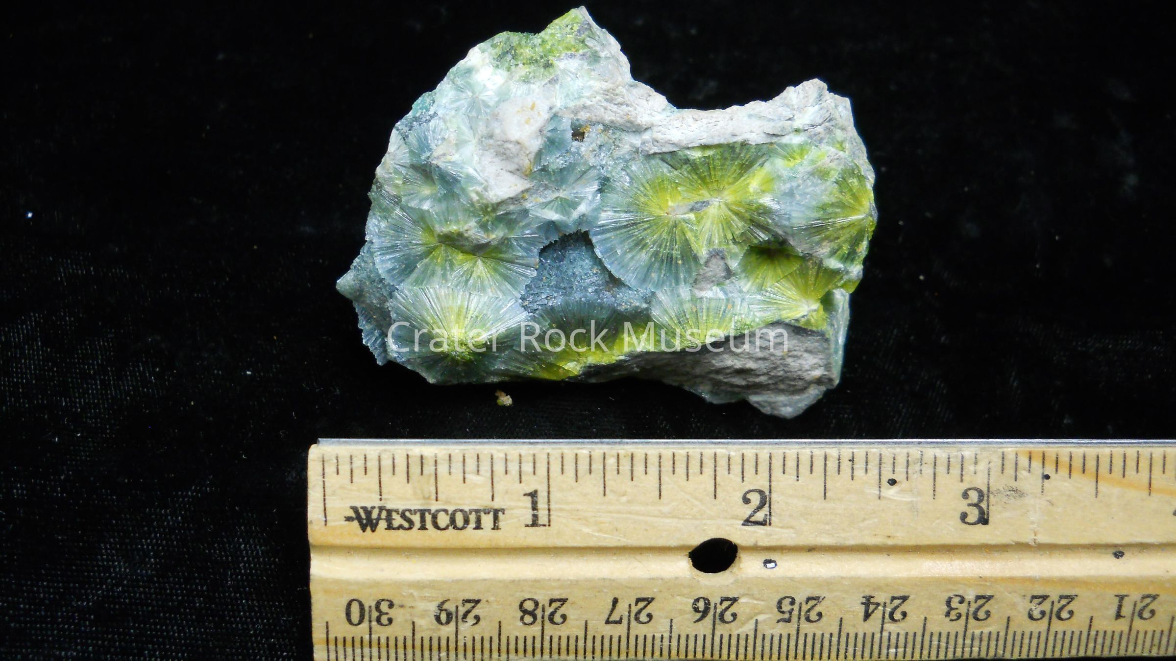 Description: Small specimen with a light green and yellow circular crystals showing spraying.