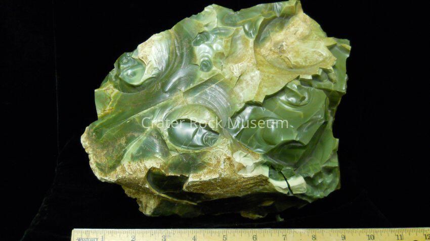 Description: A large chunk of "Morrisonite" (Jasper) also known as "Prase". Found in the Antelope refuge of the Warner Valley in eastern Oregon. Colors" This piece is various shades of olive green found in swirling "Opalized" patterns. The rock is broken in many areas along its' cleavage resembling "craters". The bottom side of piece is covered with a thick cream and brown material.