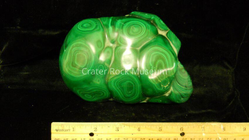Description: A piece of botryoidal Malachite with numerous mounds. The mounds have banded, dark green to light green rings. Piece has been polished.