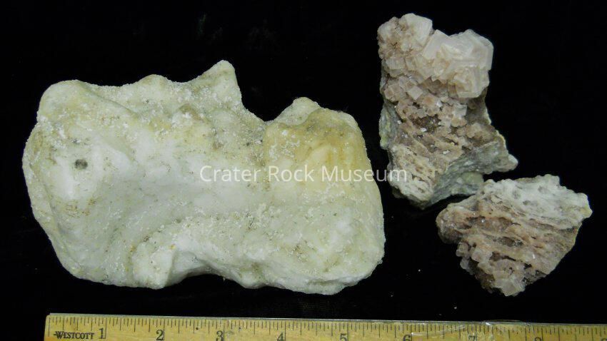 Description: Three pieces of Halite. One is white and the two smaller ones have distinct