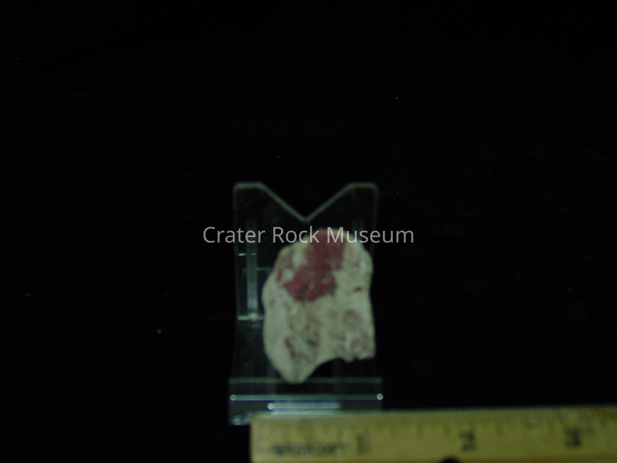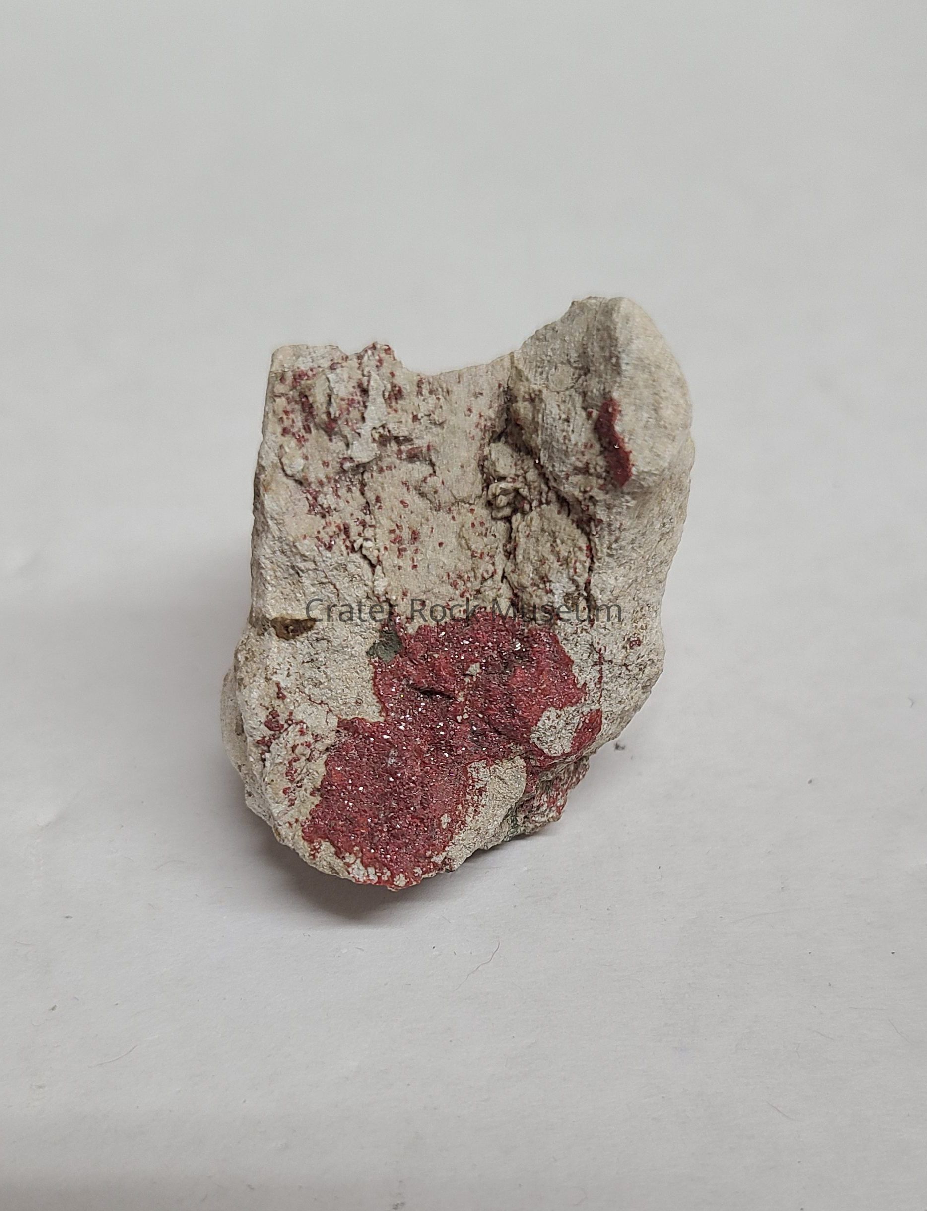 Description: Small white rock specimen with Cinnabar crystals. Colors are white rock with rose colored tiny crystals.