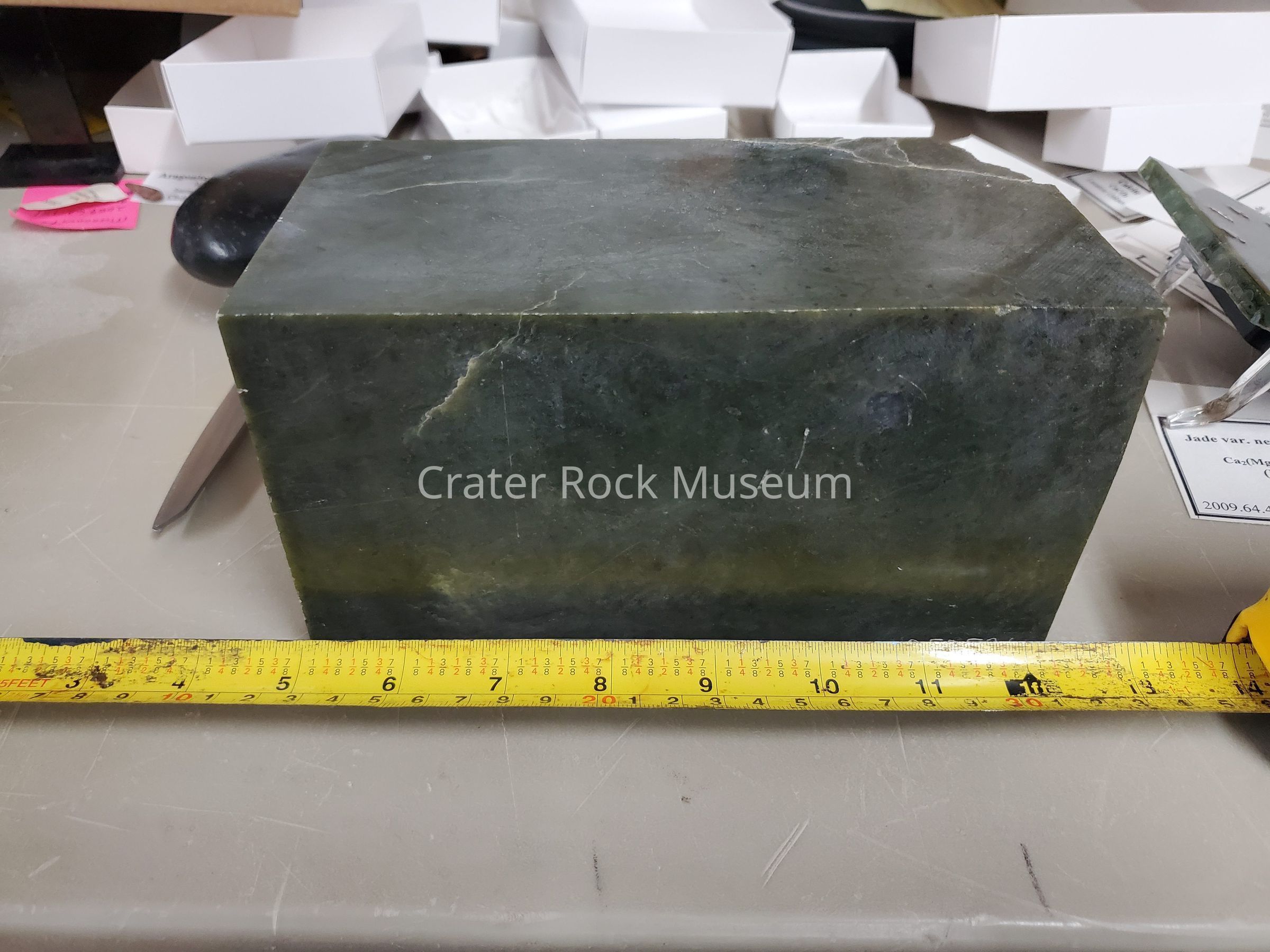 Description: A rectangular block of Jade, broken on one side.Colors are dark green with black.