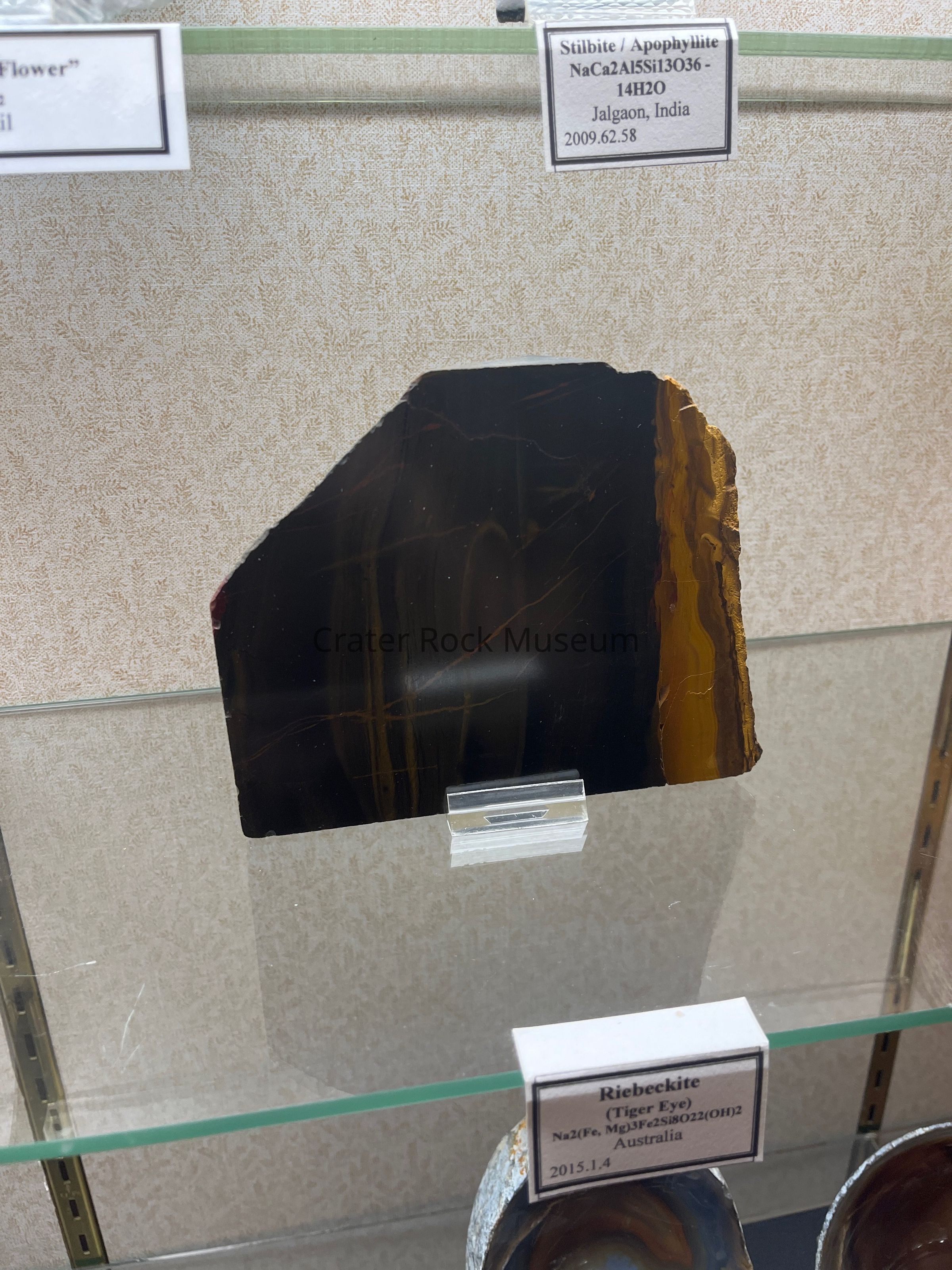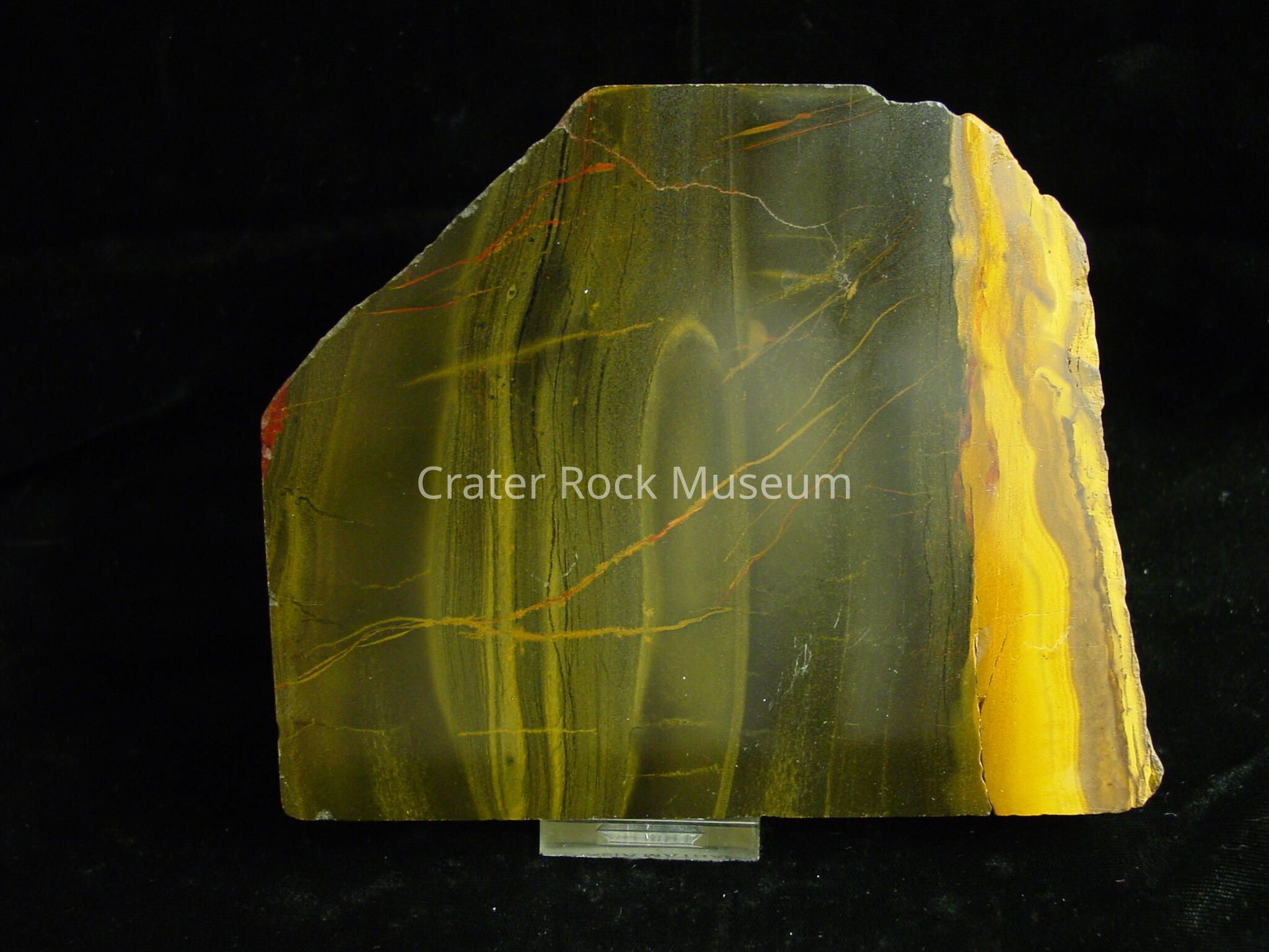 Description: A thick slab with one cut and polished surface. 5/6 of it is a black and tan color and one edge is golden browns. It has the look of wood grain.