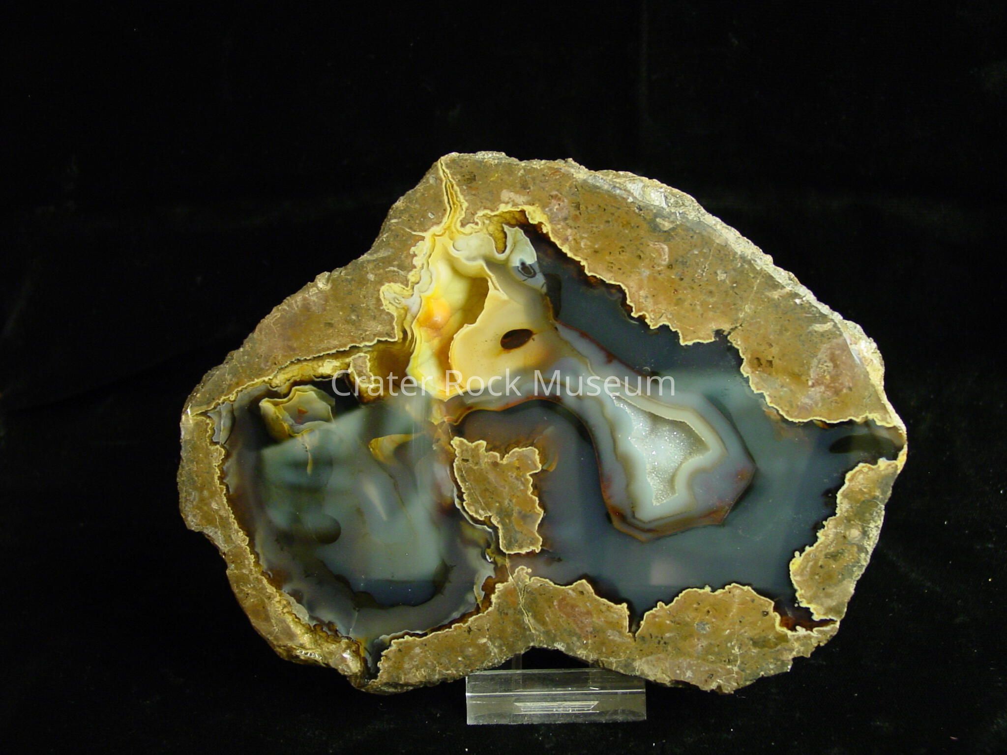 surrounded by a dark grey translucent agate. The other side is solid agate in greys to black with some yellow. There is also a small cavity lined with yellow and orange bumpy crystal.Collection