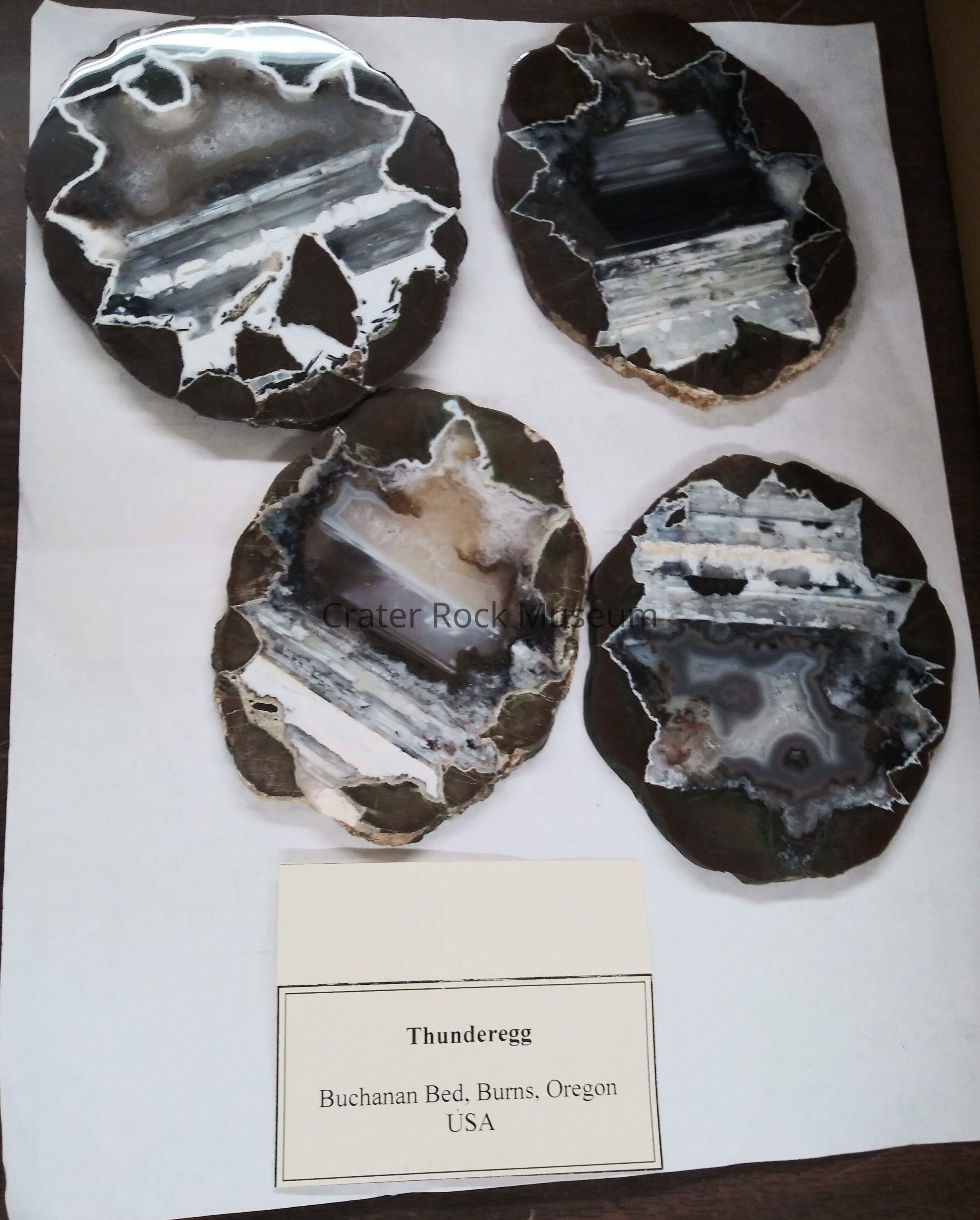 Description: Four slices of thundereggs, varying in thickness, from the Buchanan beds in Burns, OR. Polished sides show star agate centers in fortified and bedded agate in crystalline, white, greys, browns, and black. Little red seen. All are surrounded by dark brown and green rock.Dimensions