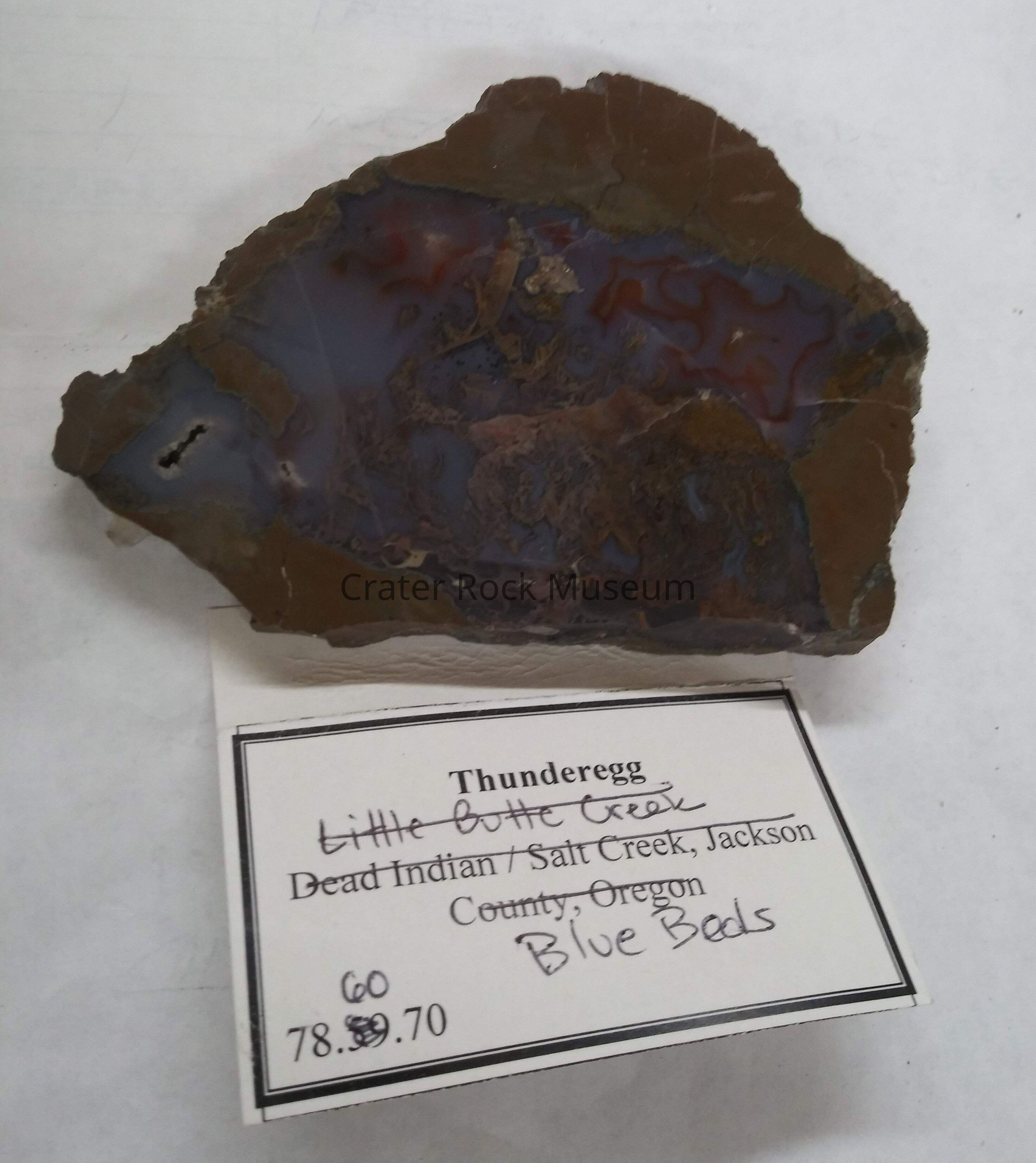 Description: A slice from a thunderegg from the blue beds near madras oregon, showing moss. outer band is chocolate brown in color, surrounding a blue center with red swirls at one half and moss in brown in the other. one corner of the thunderegg has an open crystalline hole.Collection