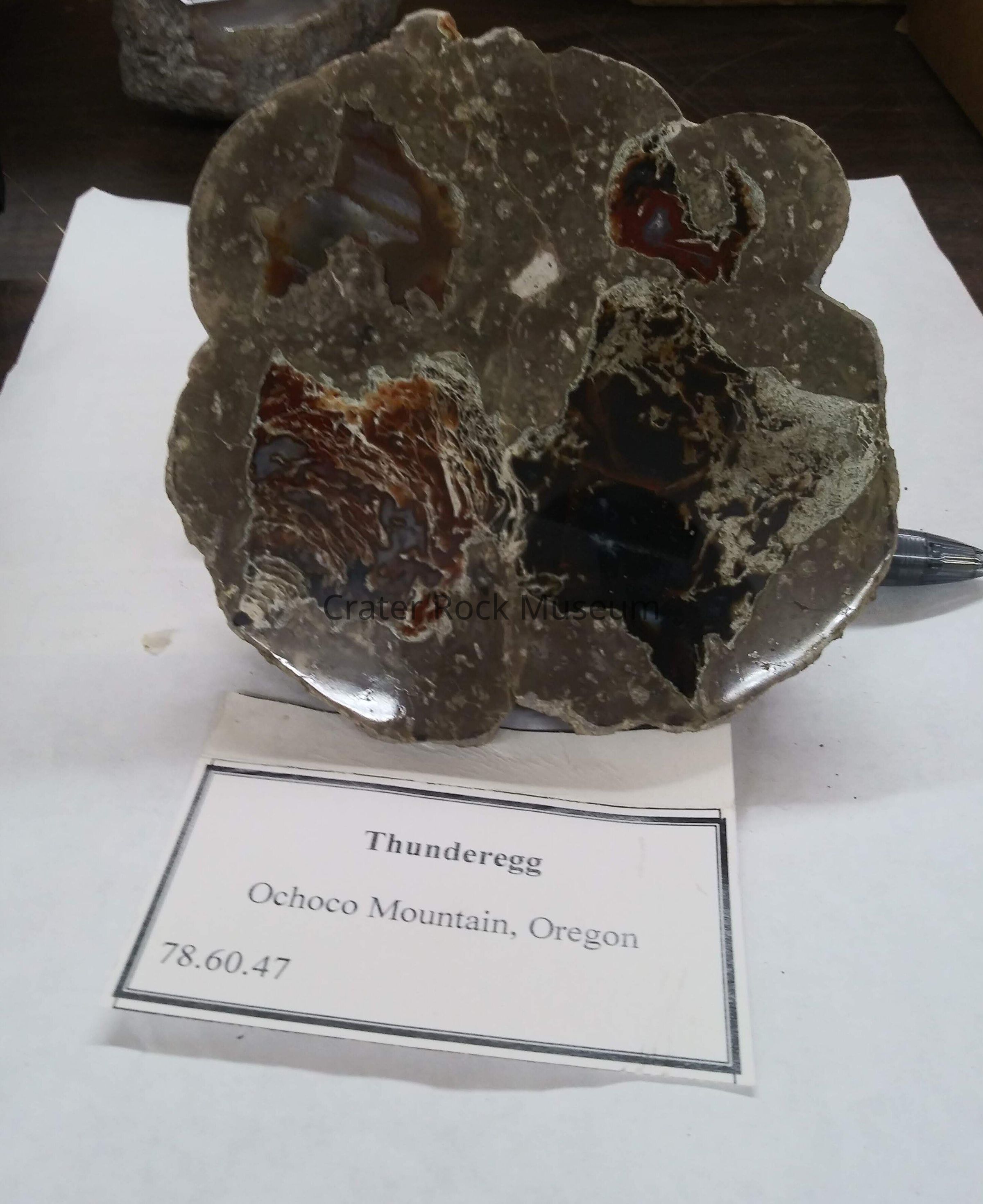 Description: One thunderegg, multiple type, cut and polished. from the ochoco mountain beds in eastern oregon near prineville. four thundereggs in grey matrix. dark browns, some grey.Collection