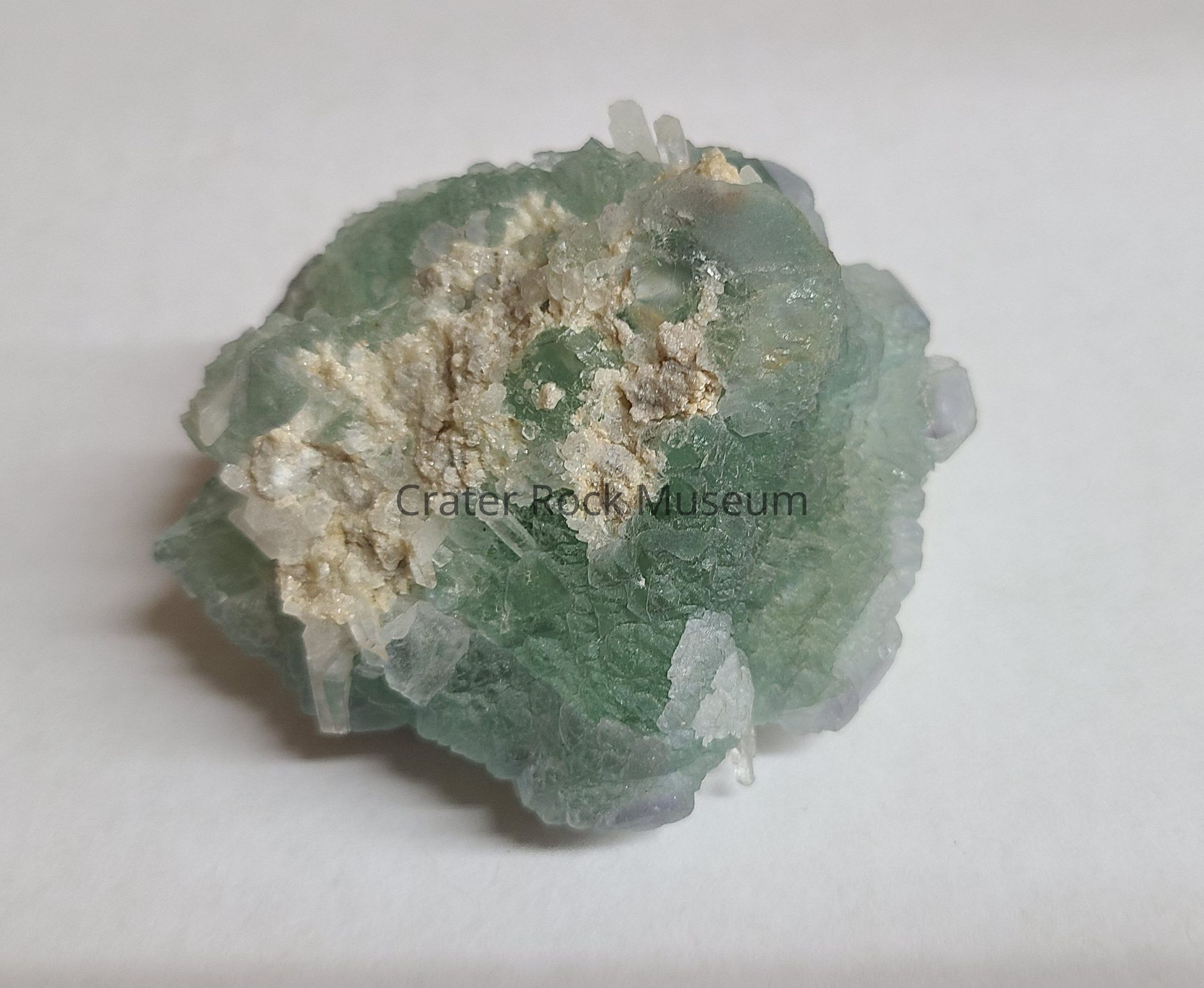 Description: A single piece of pale sea green Fluorite that has bits of quartz scattered on its surface. Was originally part of a pair, marked as 2014.1.142(A). The subsequent (B) piece was deaccessioned for sale.