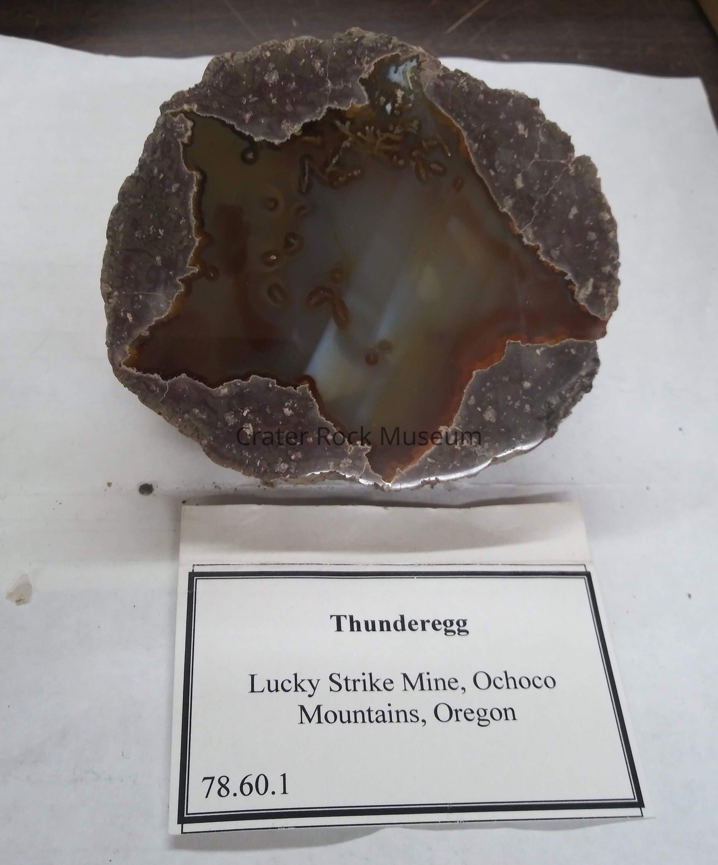 Description: ONE of a group of 22 thundereggs, found 50 miles from prineville, oregon high in the ochoco mountains. found by delmar smith and dwight mccorkle in approx 1960. all the specimens from the same bed, unusual find at that time. matrix is mother rock on the outside, silica fill on the inside, 5 multiples (more than one center). all specimens cut and polished. basic colors are red browns, gold, grey blues, and cinnebar cobalt. accession book states that the 22nd thunderegg is on exhibit at the children's museum.Collection