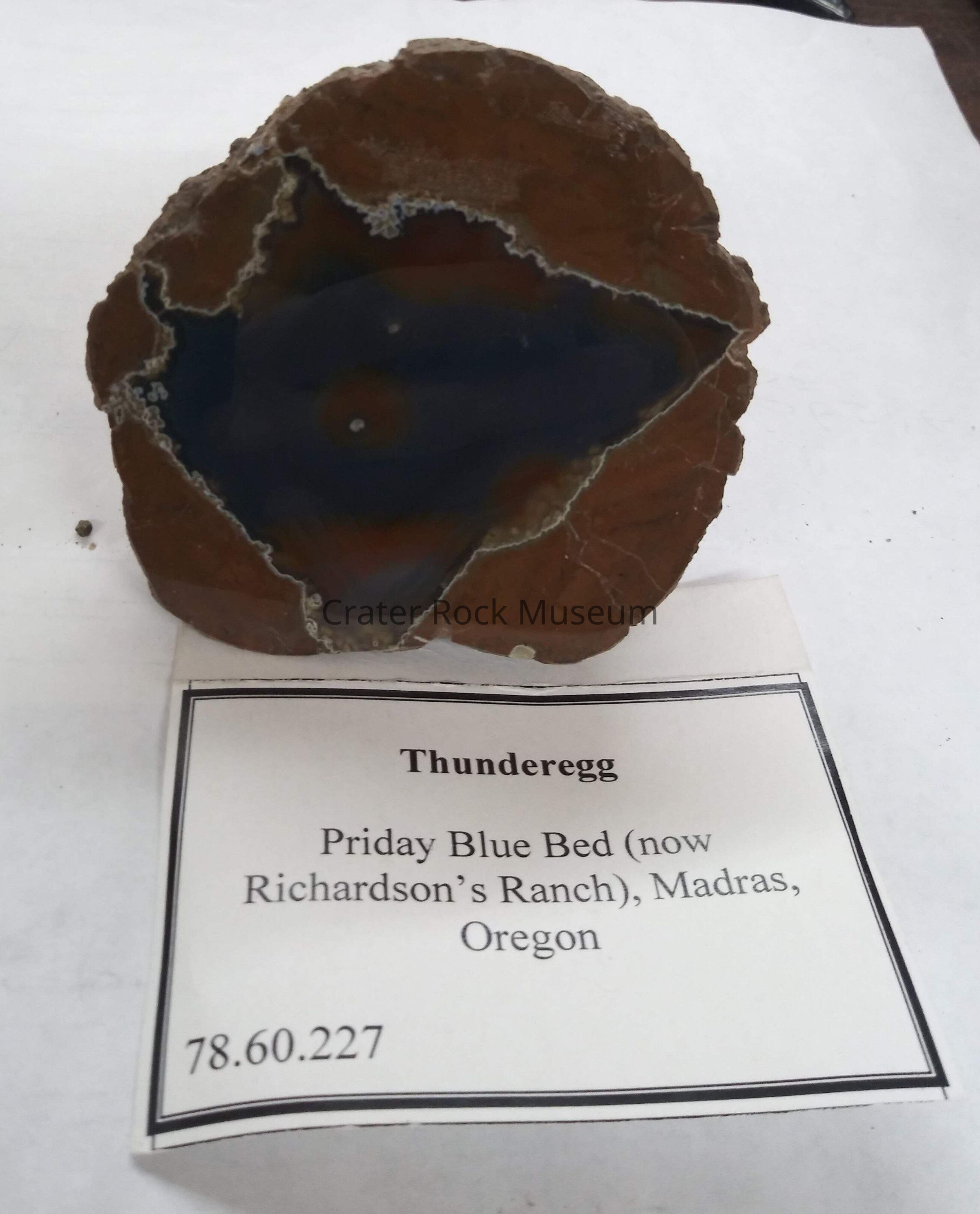 Description: One small thunderegg from the blue beds, Madras, OR. Cut sides show star center in fortified and bedded agate in blues, white, brick red, one with grey moss, surrounded by brown rock. Accession book states one of the two original tundereggs was deaccessioned to the gift shop in 2001.Collection