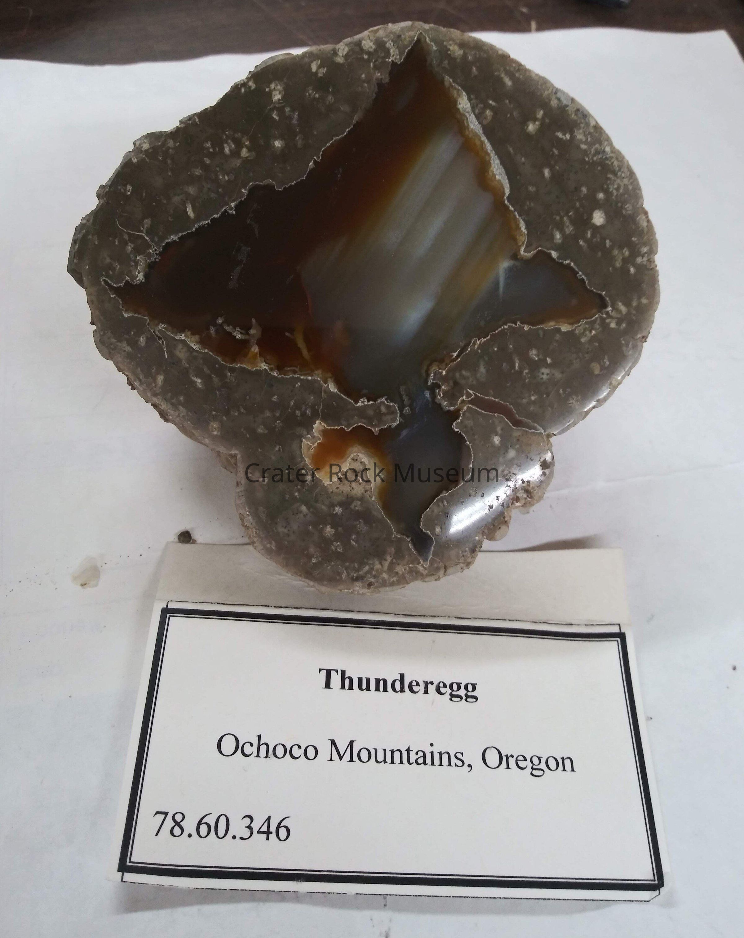 Description: A thunderegg from the ochoco mountains, central oregon. cut side shows agate center in bedded lines of greys, carnelian, and yellow, surrounded by grey, faint lavender grey and greenish rock.Collection