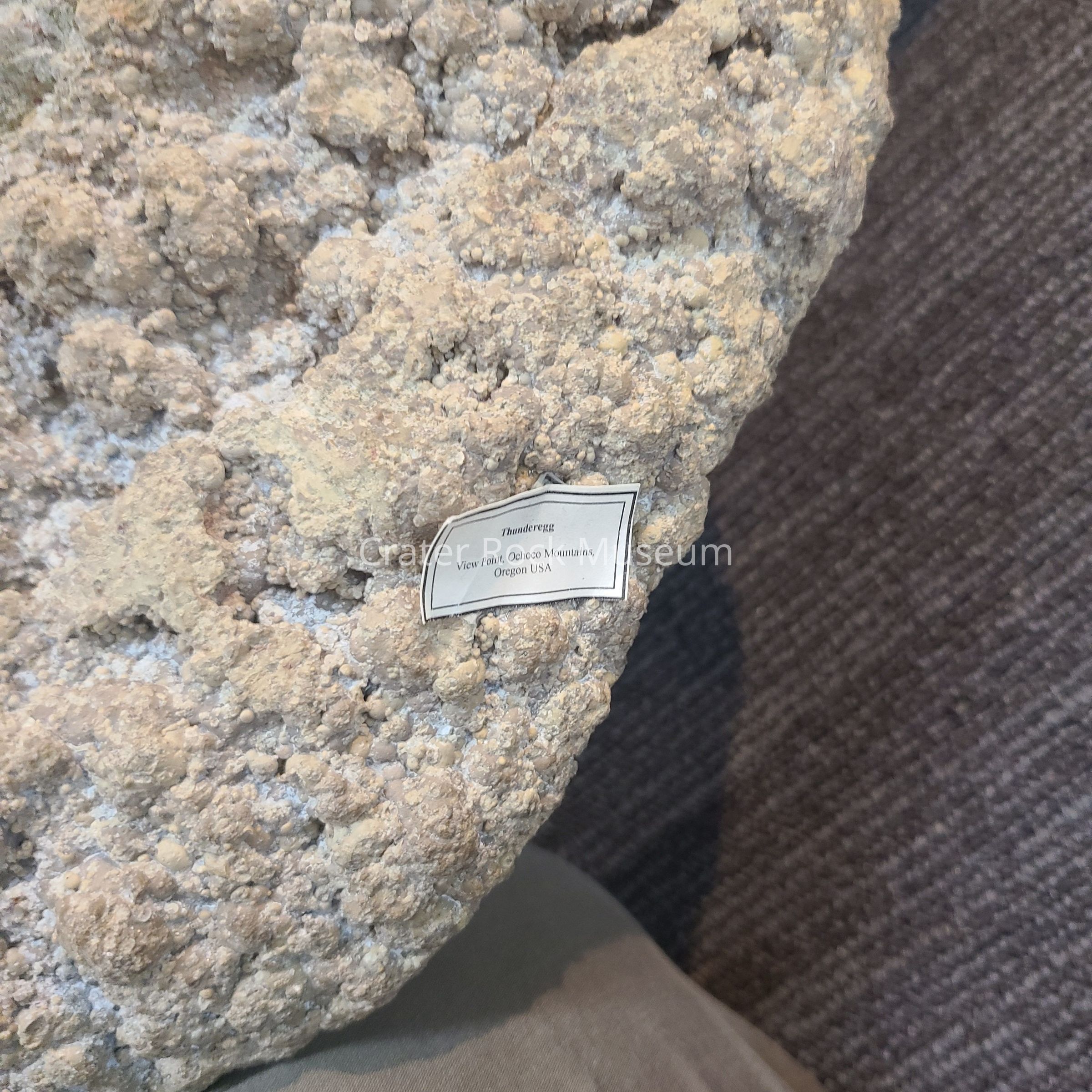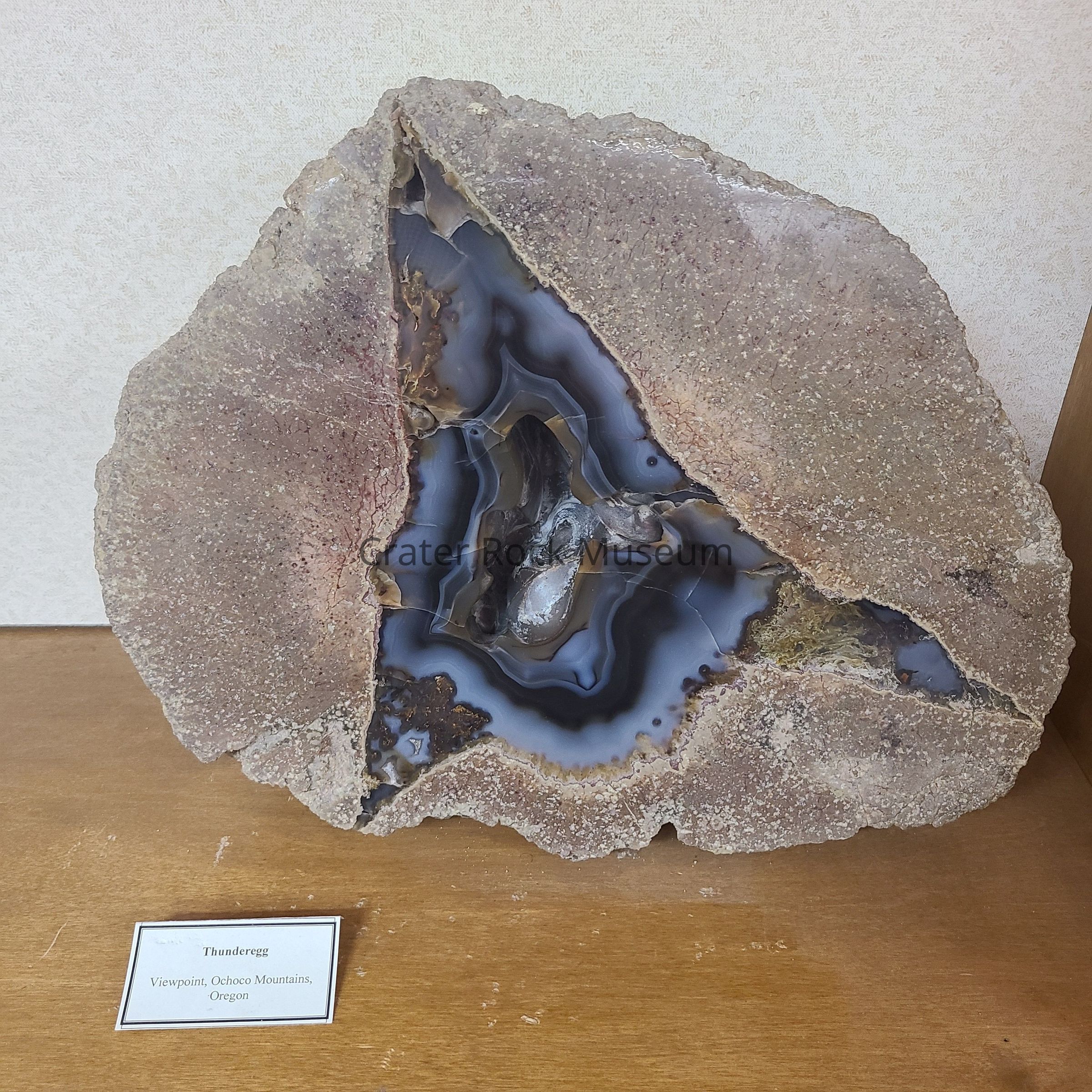 A large thunderegg geode with a botryoidal open center and outward radiating blue, grey and cream bands