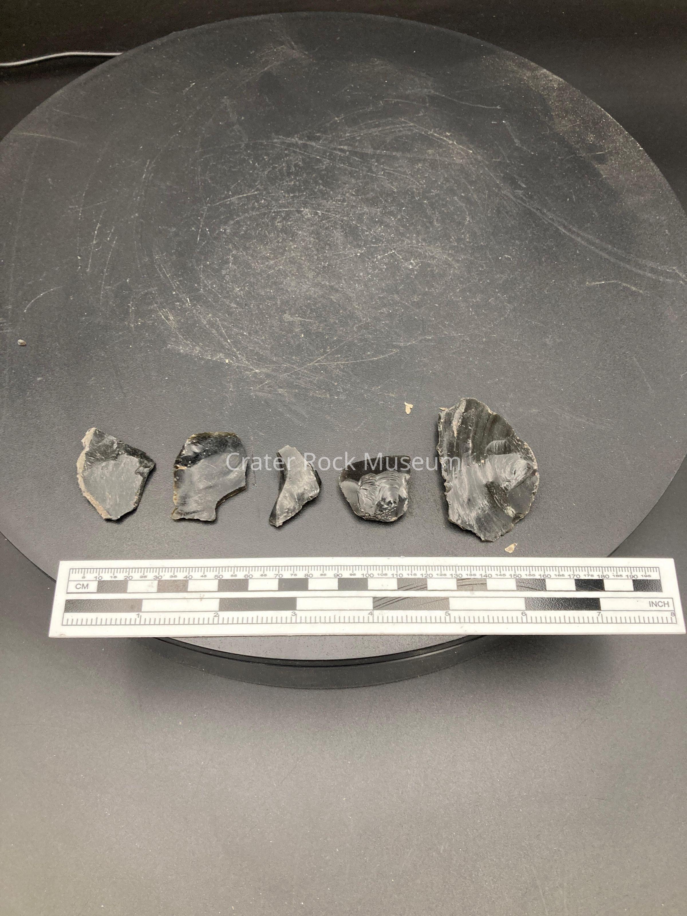 5 obsidian secondary flakes from tool production. Object ‘a’ is on the left going to the right.