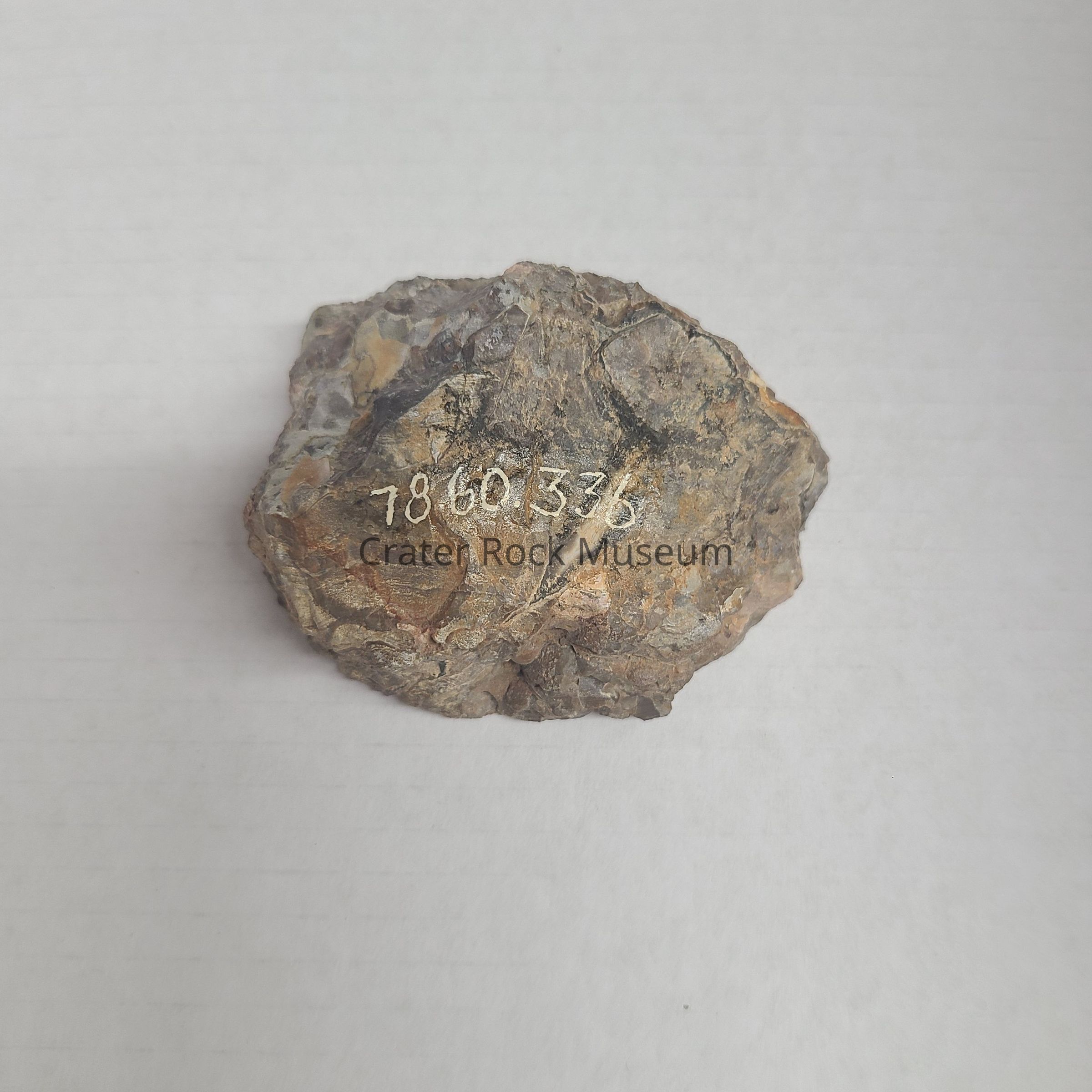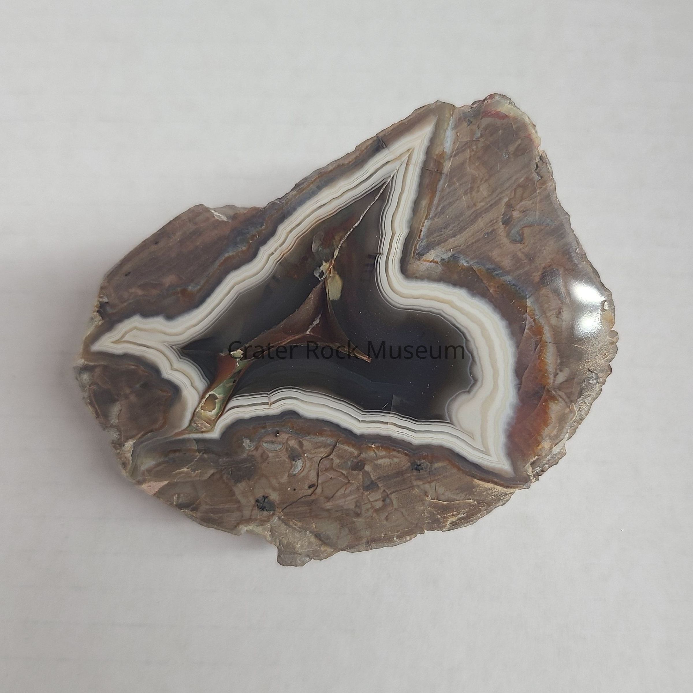 A Thunderegg from Deming, NM. Cut side shows Agate enter with open middle in Dark Grey and White, some Red and Black inclusion. Surrounding rock is in Pinkish Grey, Grey and some Orange.Dimensions