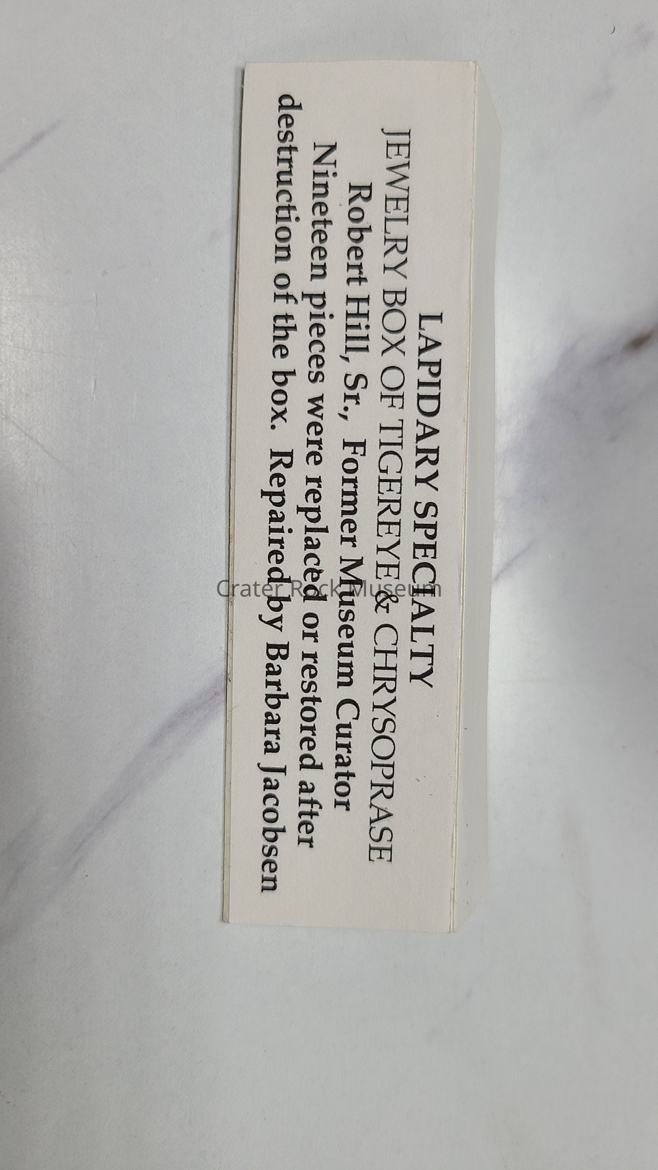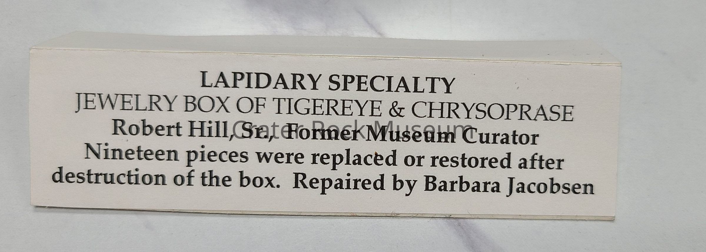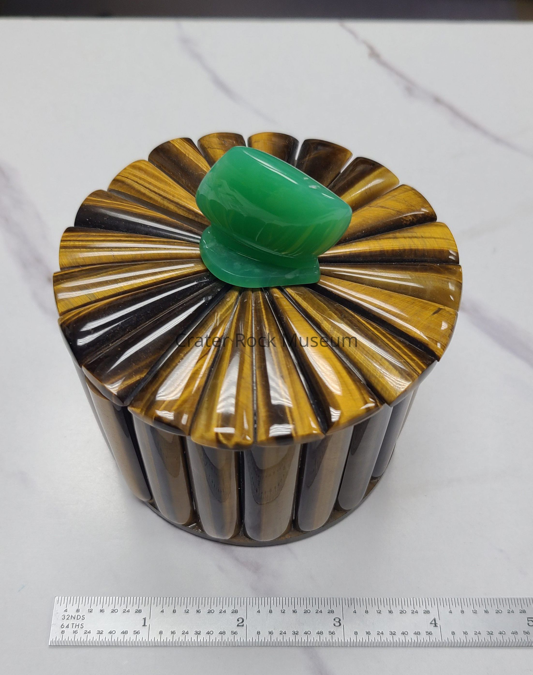 lapidary jewelry box of tiger's eye with a chrysoprase ornament
