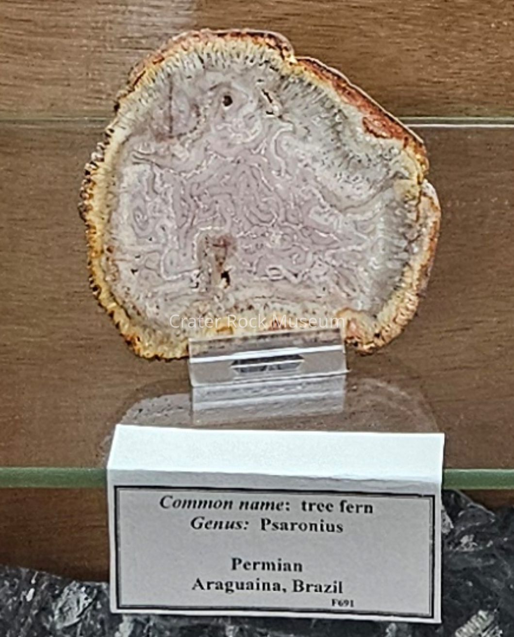 The preserved examples from Pedra do Fogo Formation, in the Maranhão Basin (northeastern Brazil, near Araguaína) exhibit remarkable cell preservation and exquisite coloration. Much of the recovered wood material from this formation is of the tree ferns Psaronius and T. singularis, with fewer examples of the fossilized stems being of Calamites. Conifers such as Dadoxylon are also found.