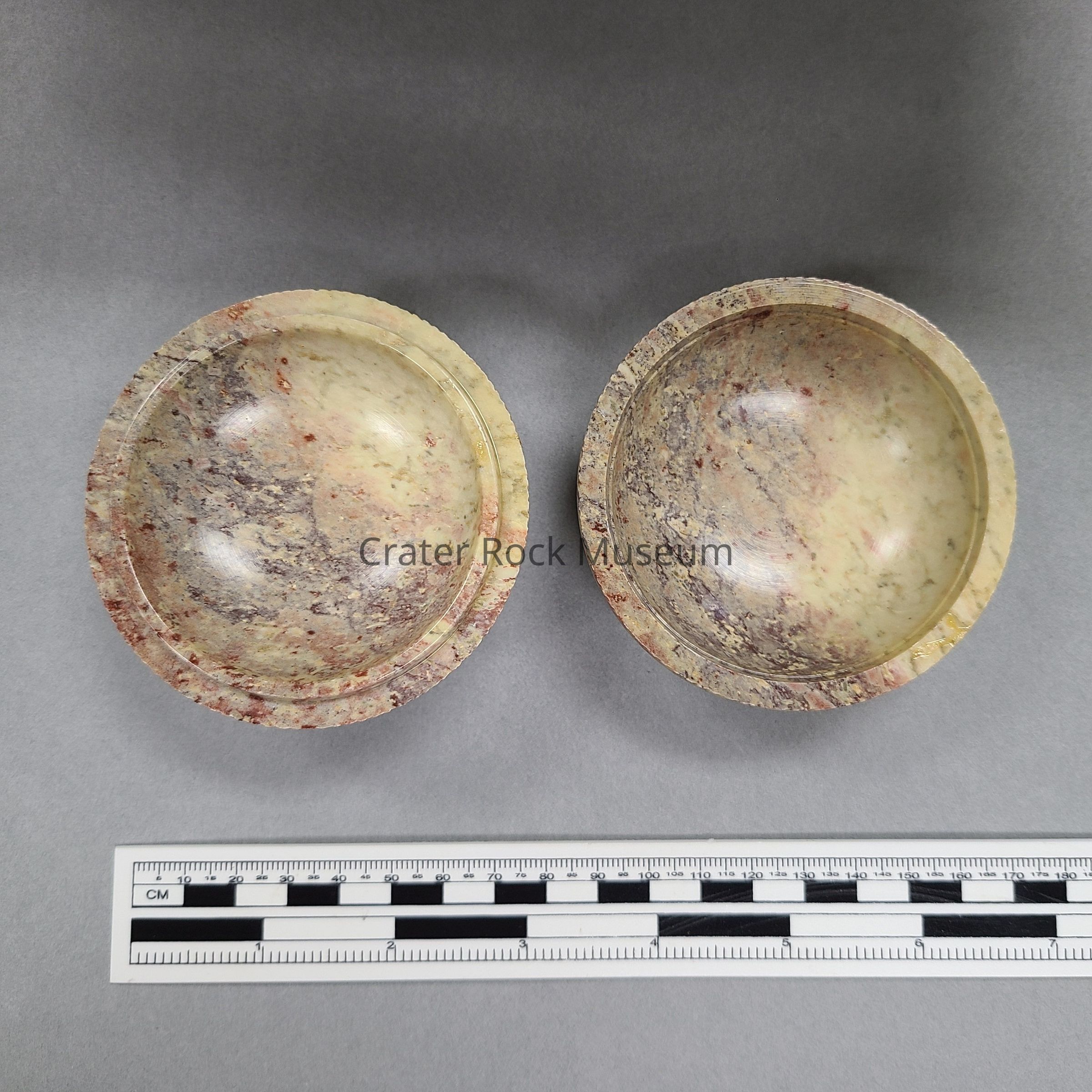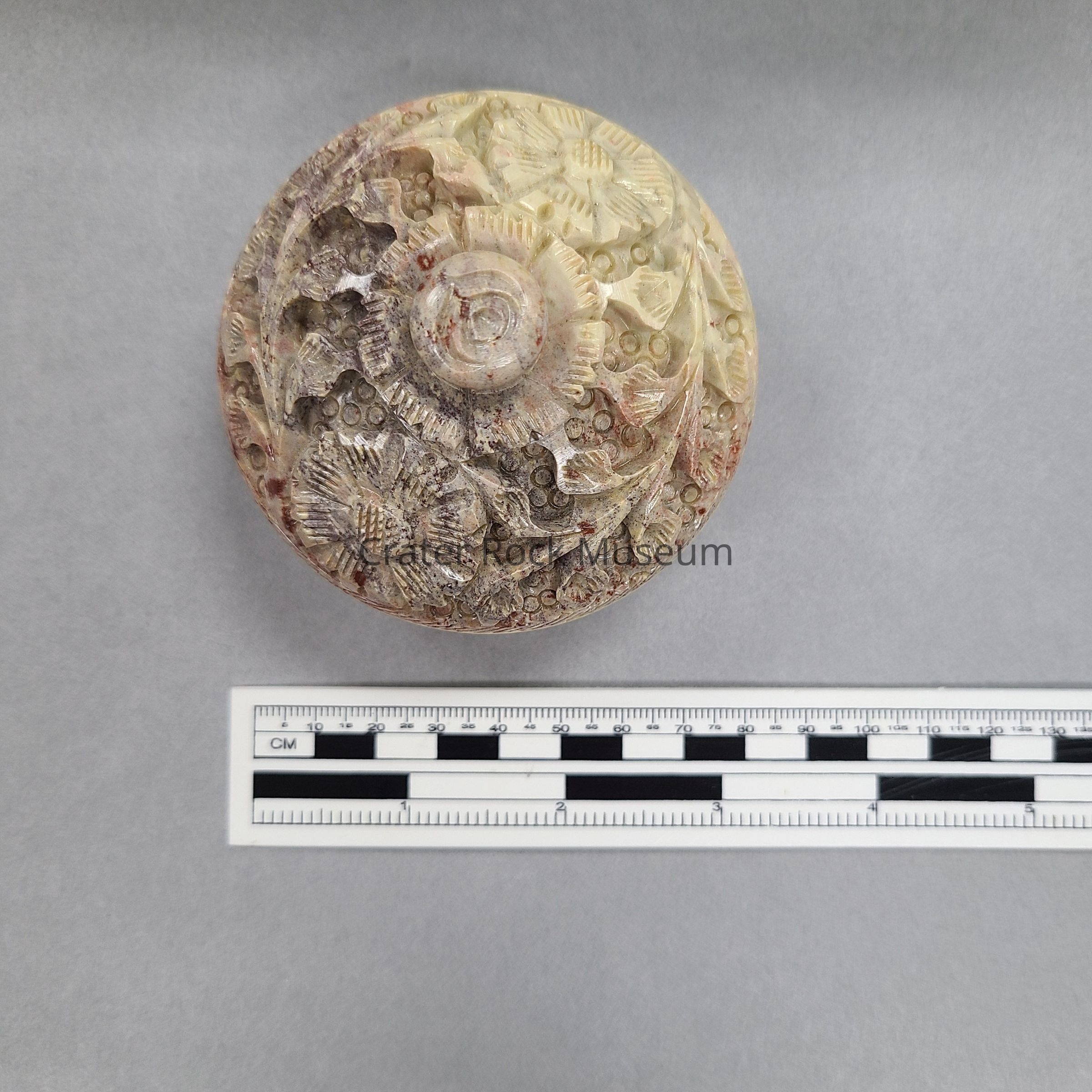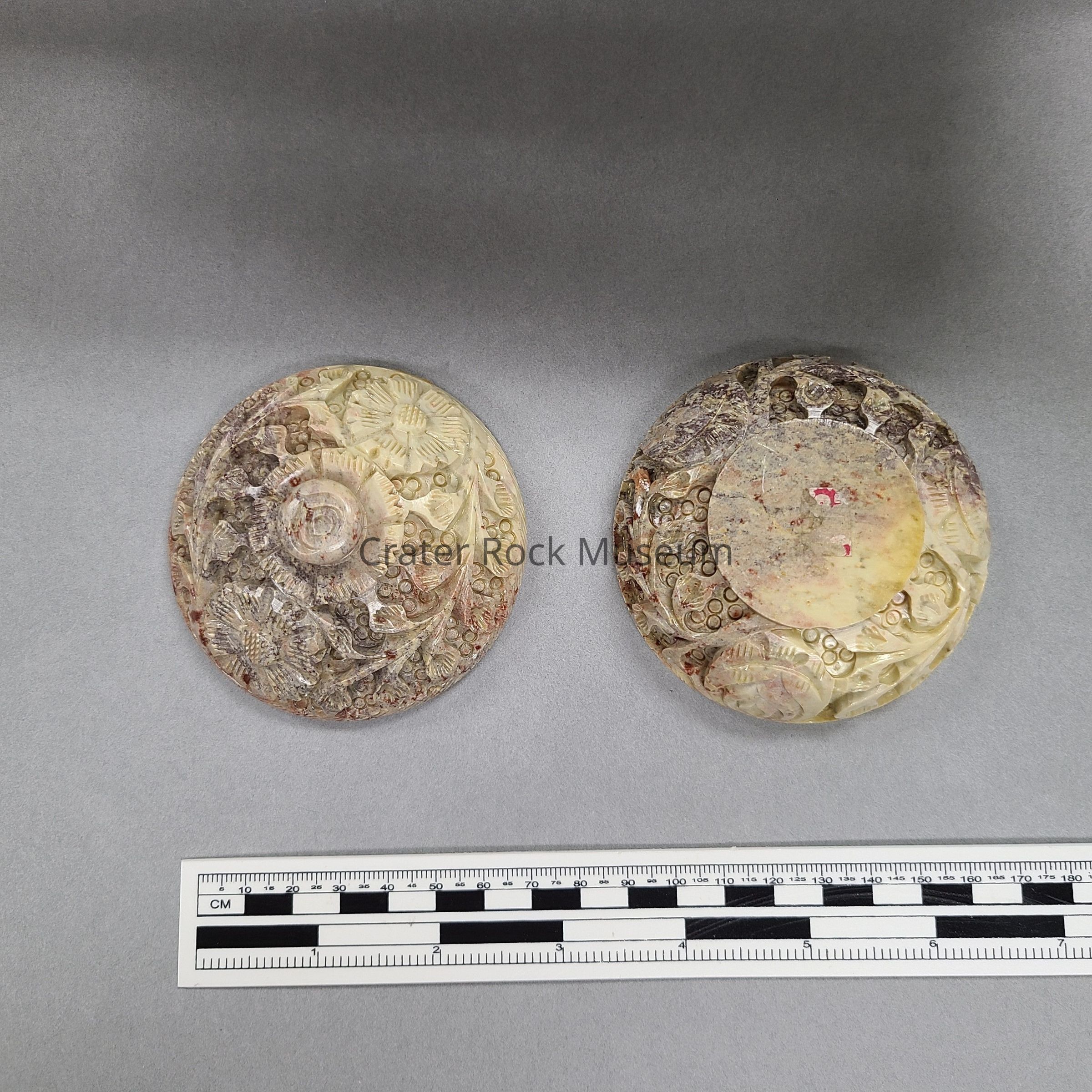 Carved bowl in two pieces. Floral designs. Soapstone. Beige/Red/Creamy Yellow.