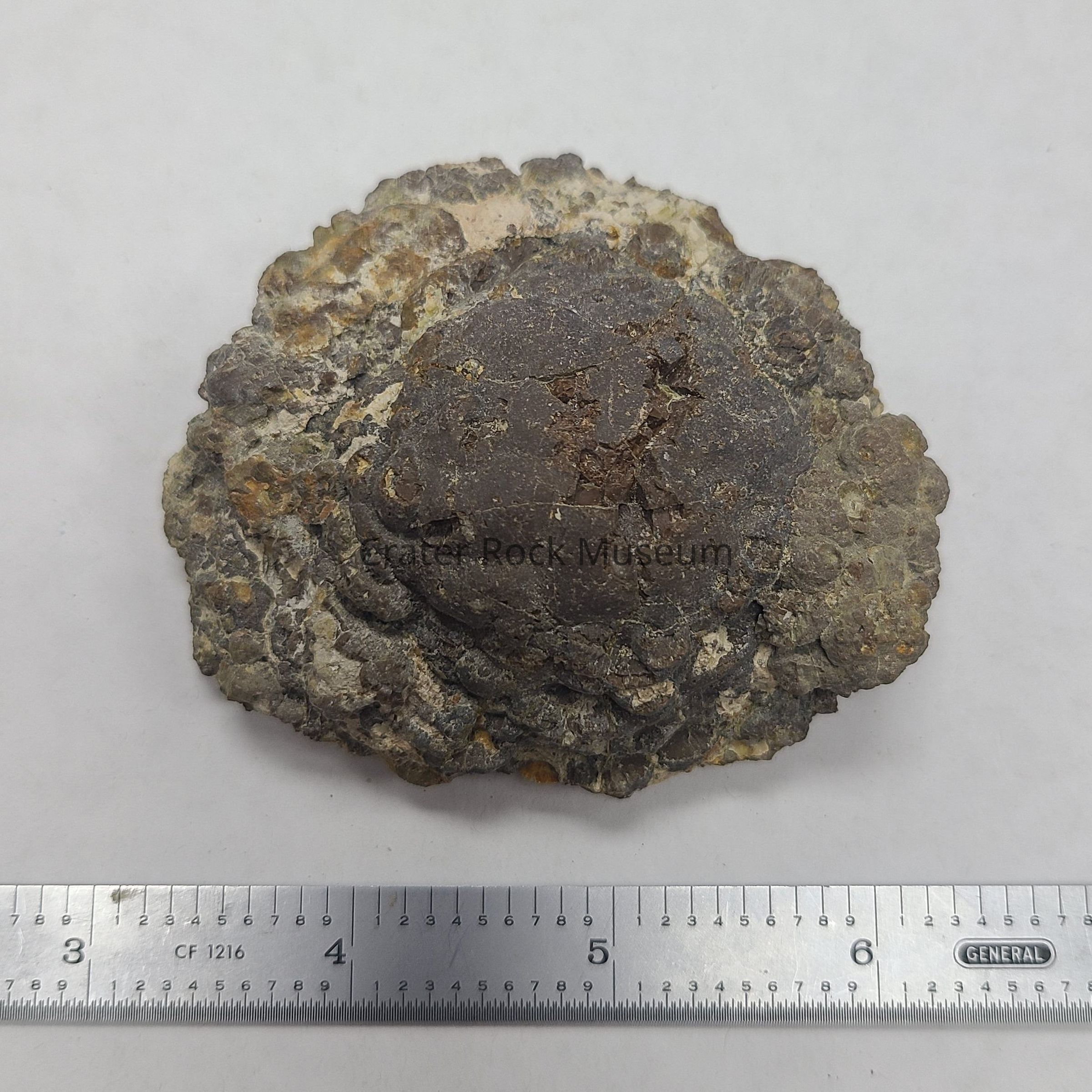 sides worn down or broken away, interior has dime sized central node and more than a dozen formed or partially formed nodes- surface looks blisteredLocation