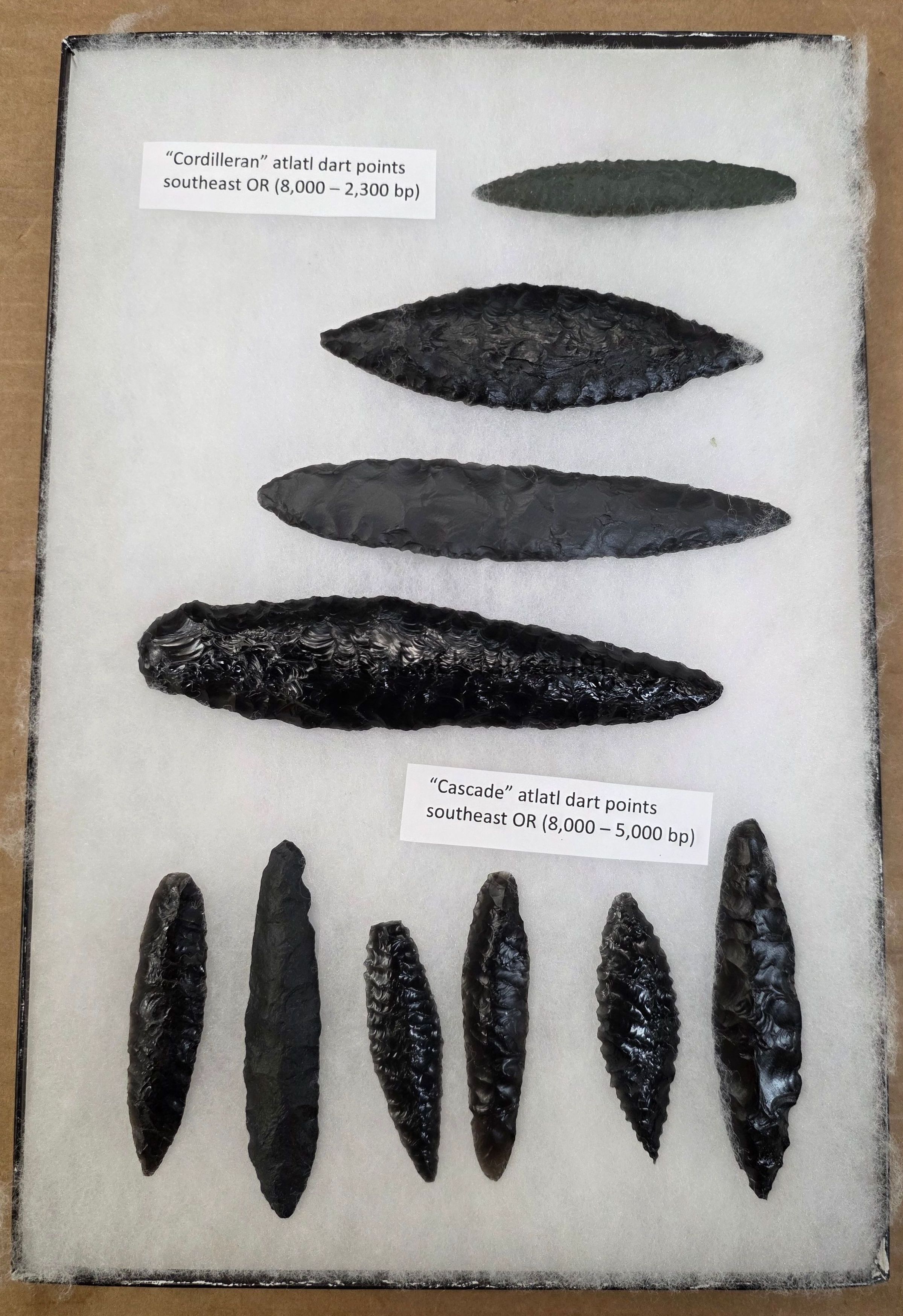 10 obsidian and flint projectile points- 4 Cordilleran and 6 Cascade forms- in an 8"x12" Riker frameCollection