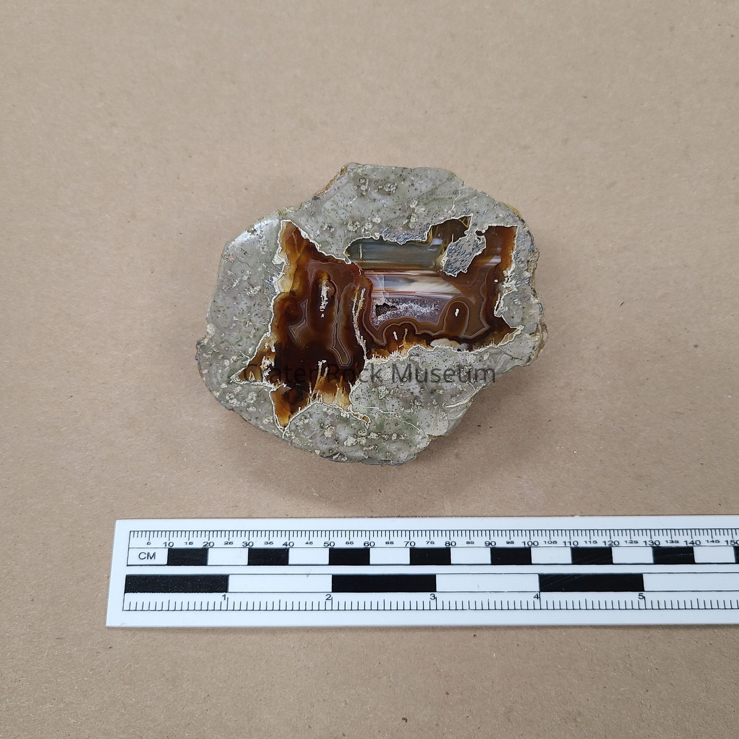 1/2 cut thunderegg with polished face. Interior contains fortification lines of white, yellow, caramel, blue and grey with drusy amethyst center. Lacy tunes also present around the edges of the fill.Location