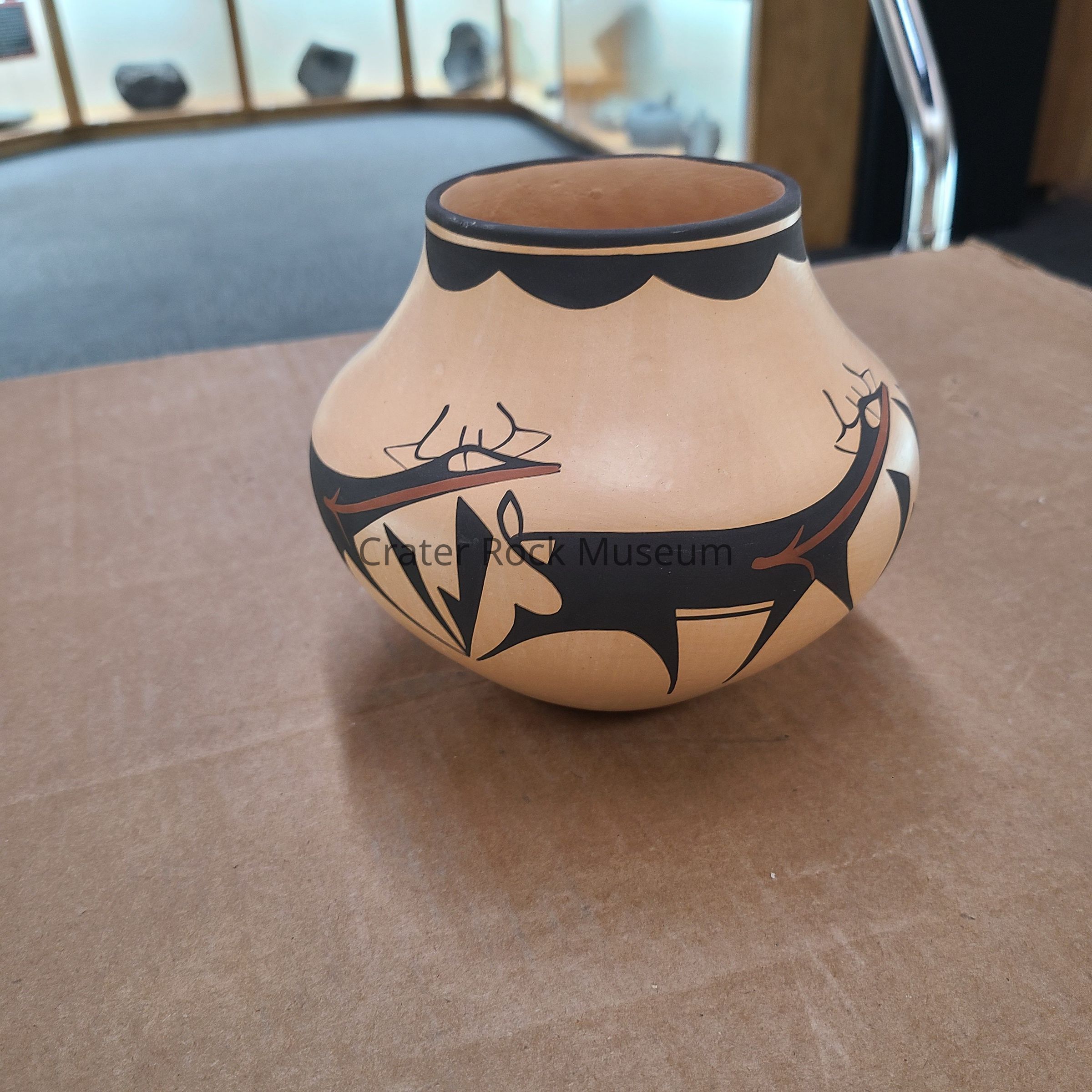 Painted earthenware vessel featuring 4 heartline deer signed by artist A(nderson) PeynestaLocation