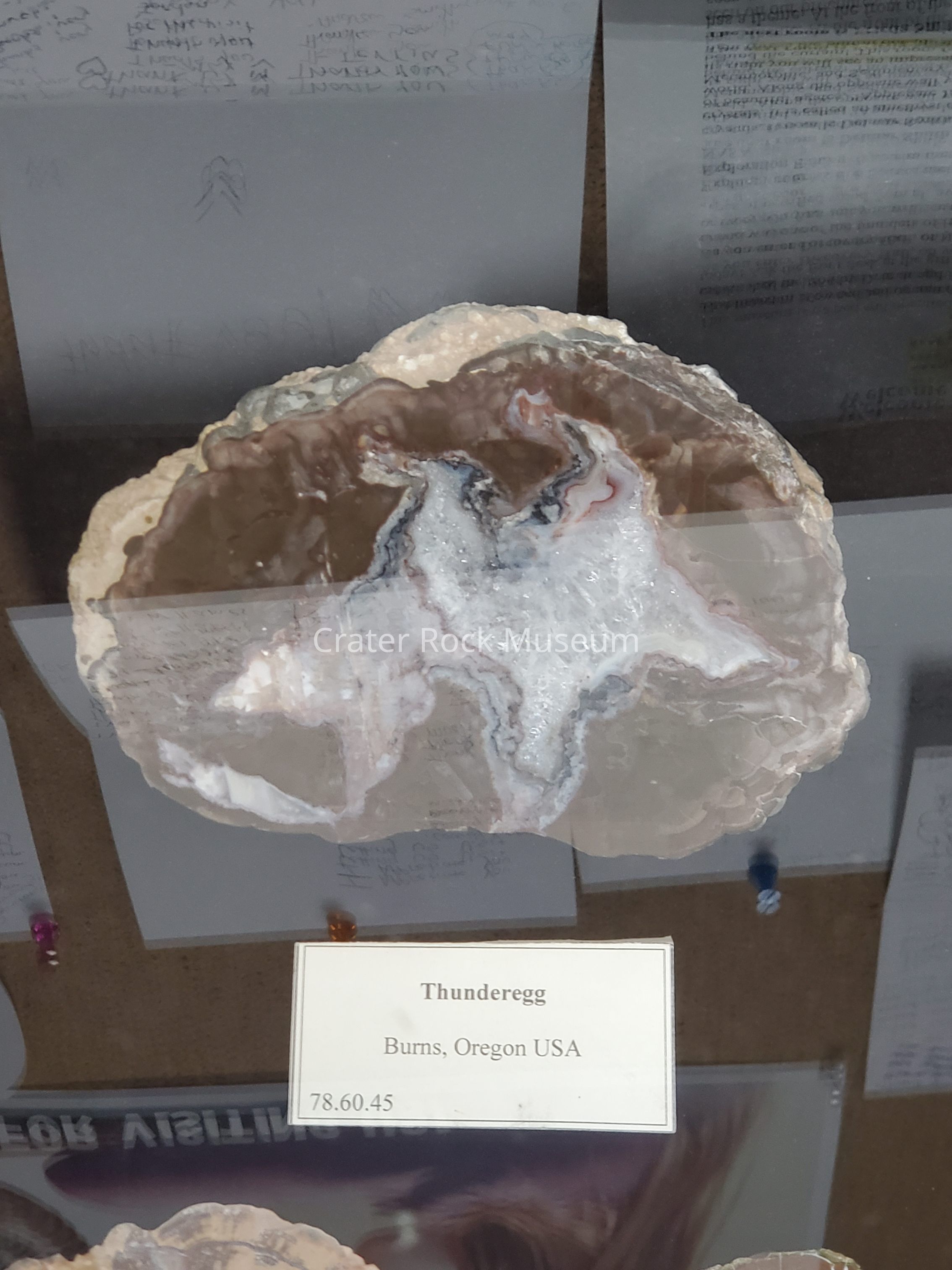 One Thunderegg cut and polished from Burns, OR. Shows Brown matrix with some Red and Black in fortification bands around a solid White Quartz Crystal center.Dimensions