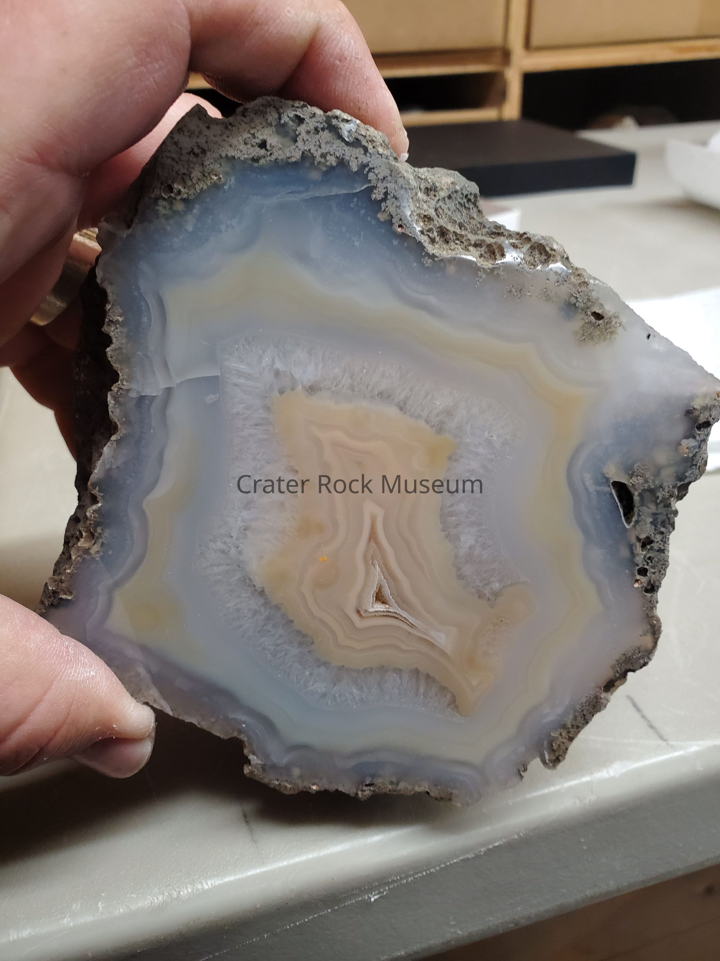 An Agate from Butte Creek, Jackson County, OR. Polished side shows fortified Agate in Orangy Creams, Yellows, Crystalline, Greenish Cream and Greys. Surrounding rock is Grey. Small open Crystalline hole in center.Dimensions