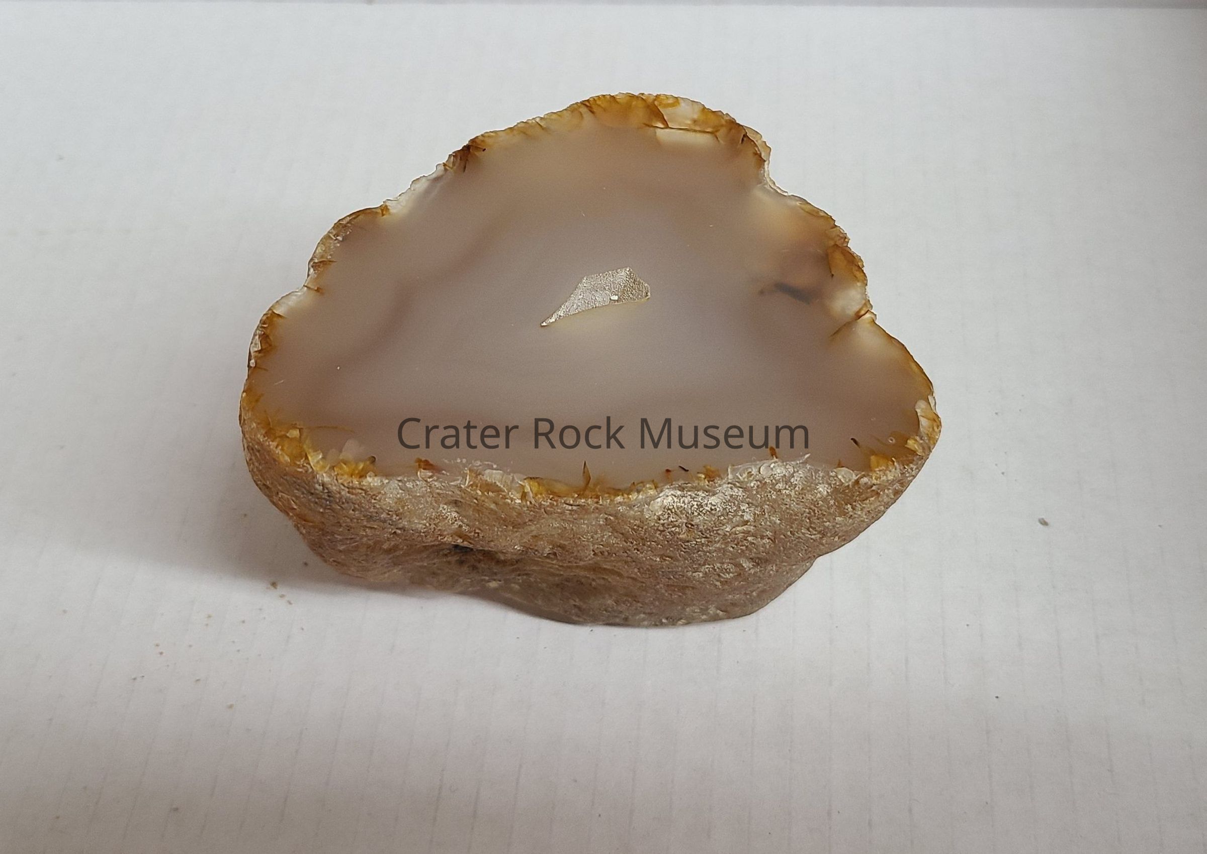 A triangular Agate from Bear Creek, Jackson County, OR. Cut side shows a small partially open Crystalline center in White surrounded by blurred fortified Agate in Greys with a Darker Grey line midpoint between center and edge. Some Orange at outer edge. A Black Dendritic Spot is seen to one edge behind surface.Dimensions