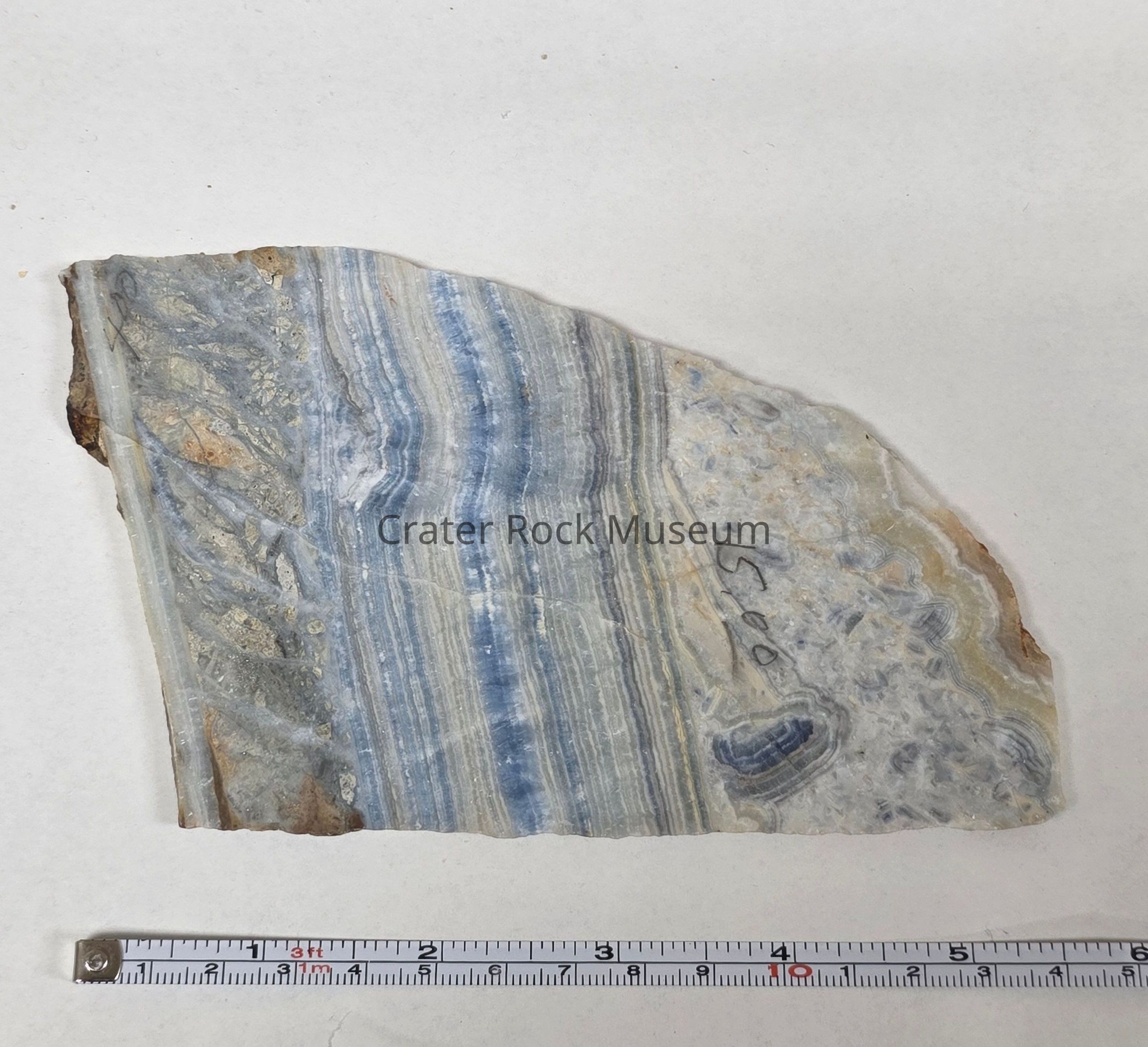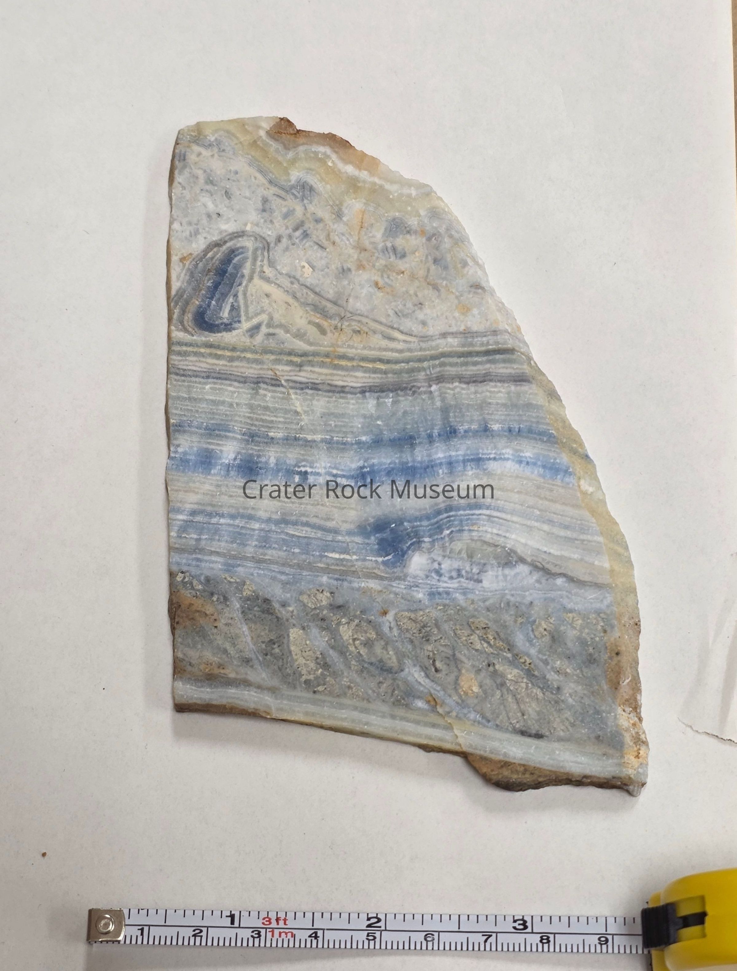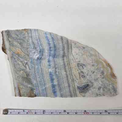Thin unpolished slab with alternating bands of white and light blue.Location