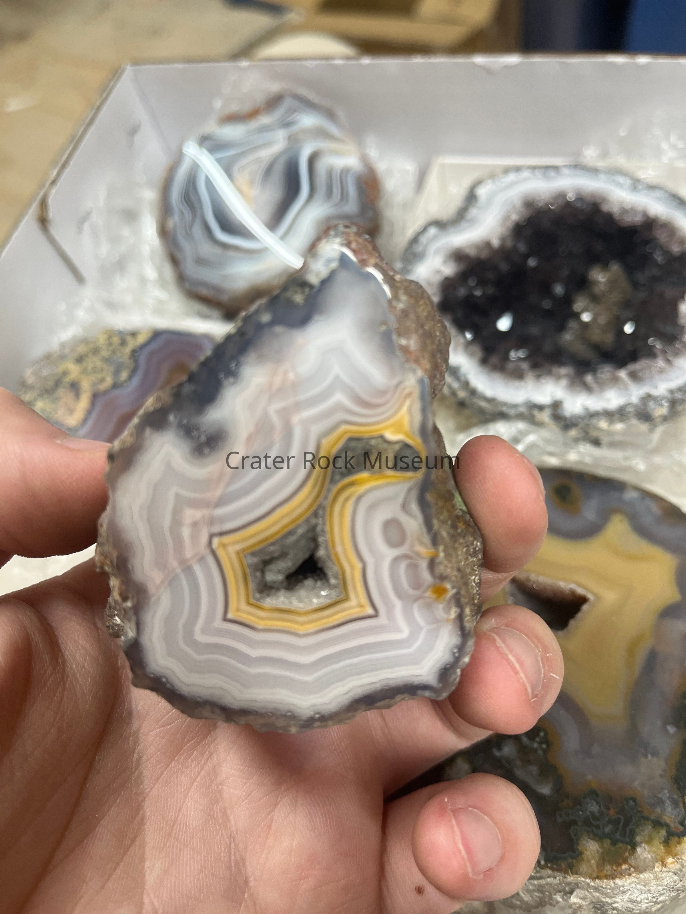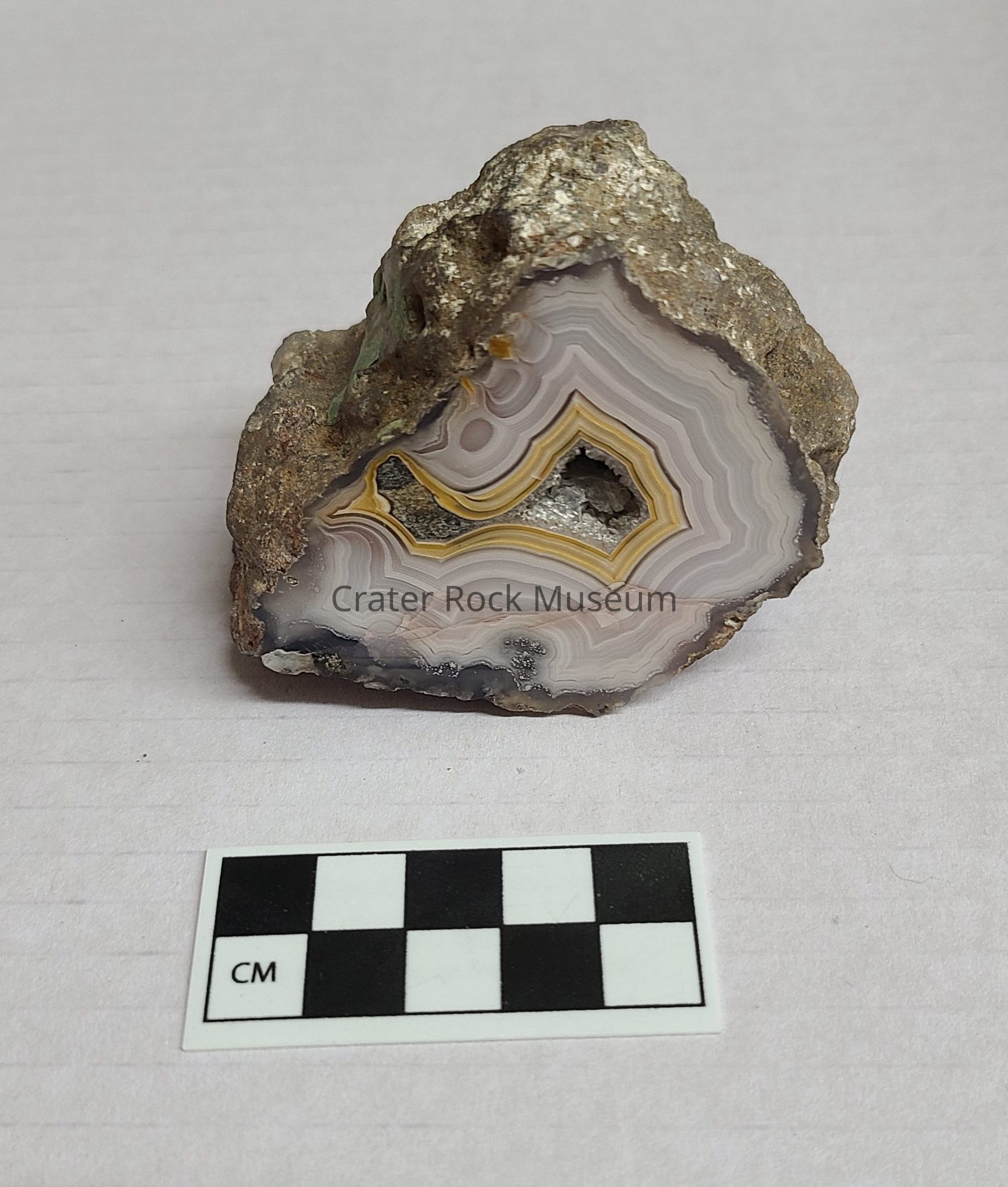 One Agate showing distinct fortification lines of White, Pinkish Gold around a somewhat hollow Crystal center. Found in Mexico.Dimensions