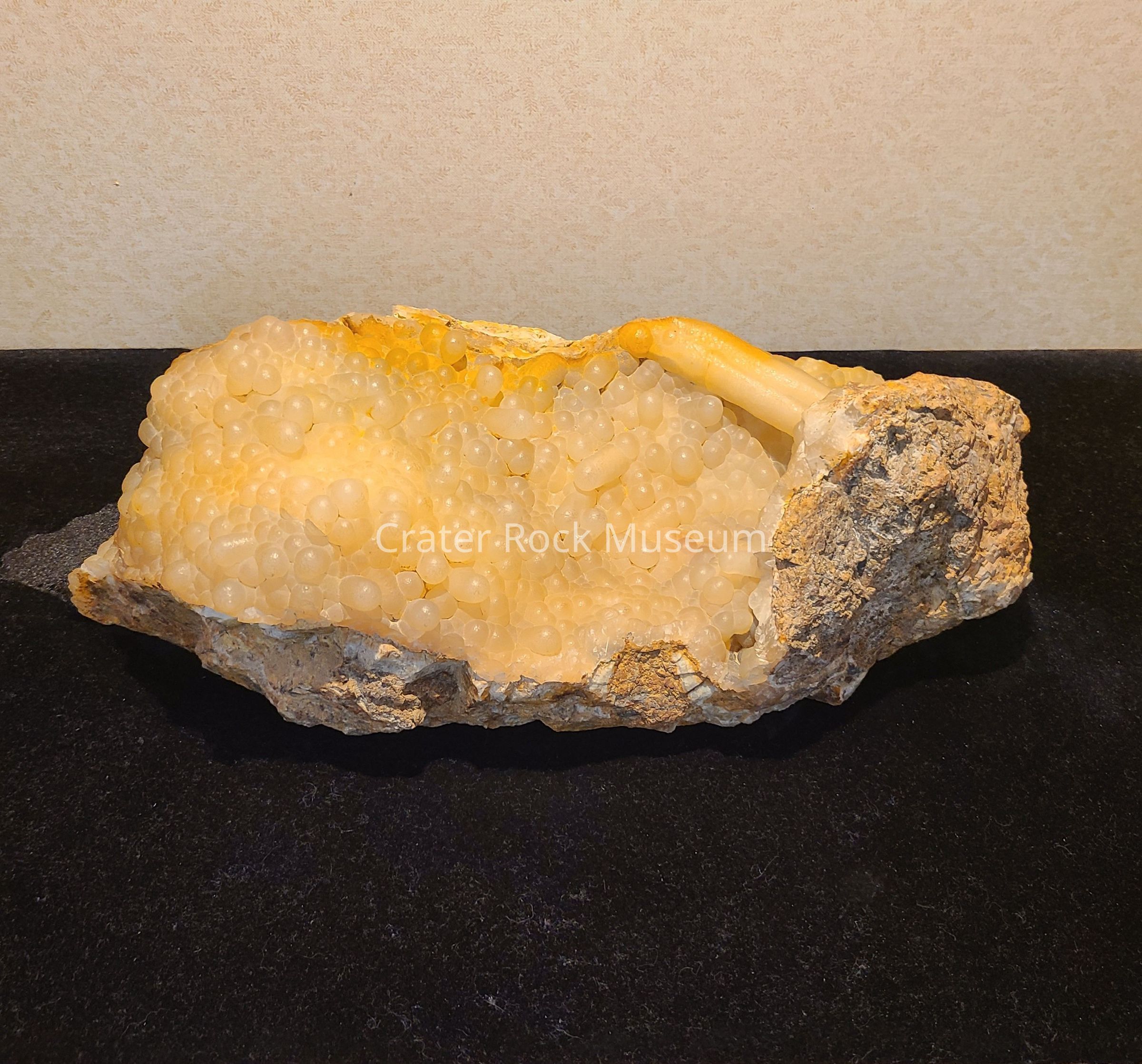clear creamy to yellow botryoidal atop on the a potchy grey matrix, one large yellowed tube stretches across the upper portionLocation