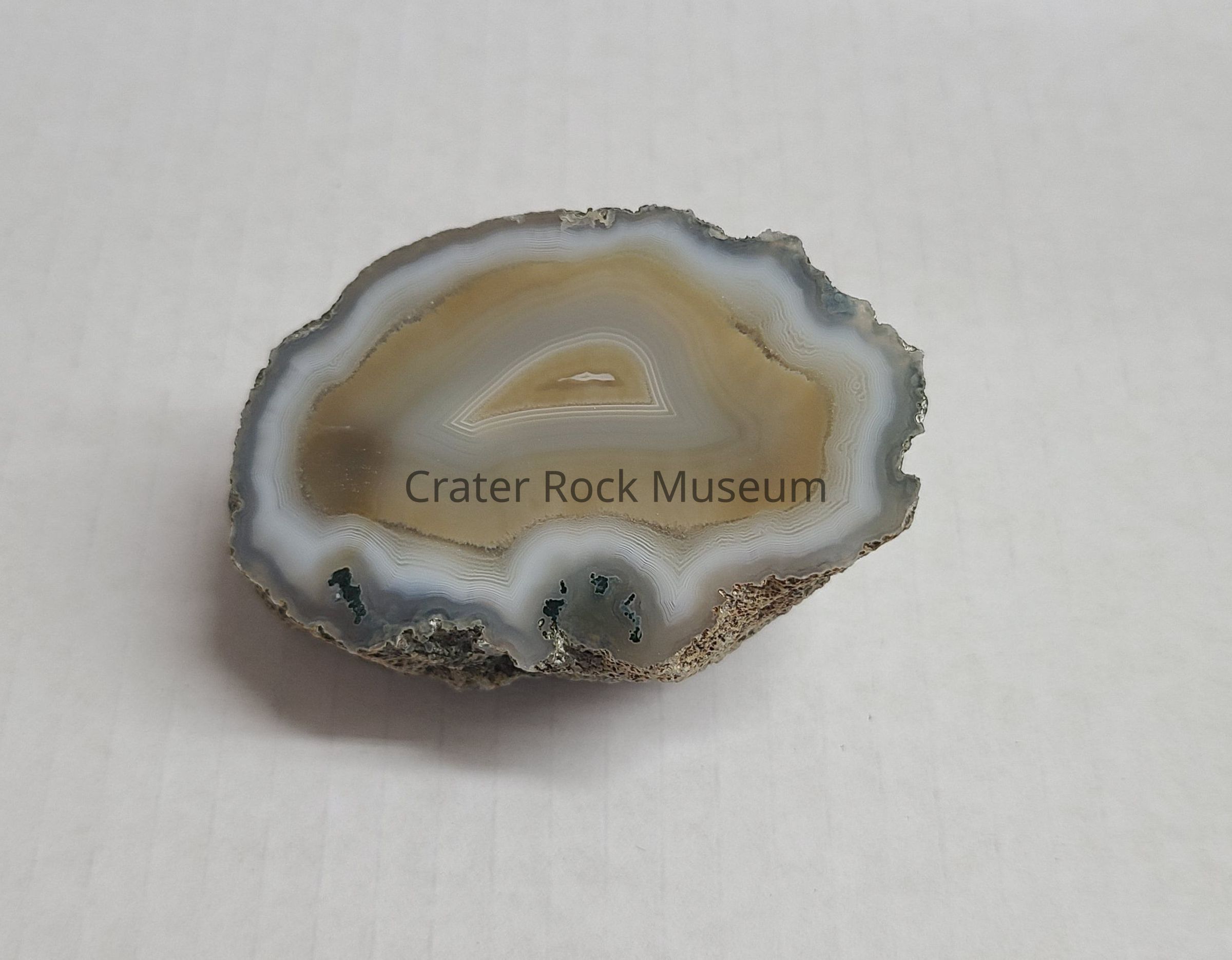 An Agate from Butte Creek, Jackson County, OR. Polished end shows fortified Agate in White, Yellow Cream, Pale Blue and Pale Blue Grey with some Green inclusions.Dimensions
