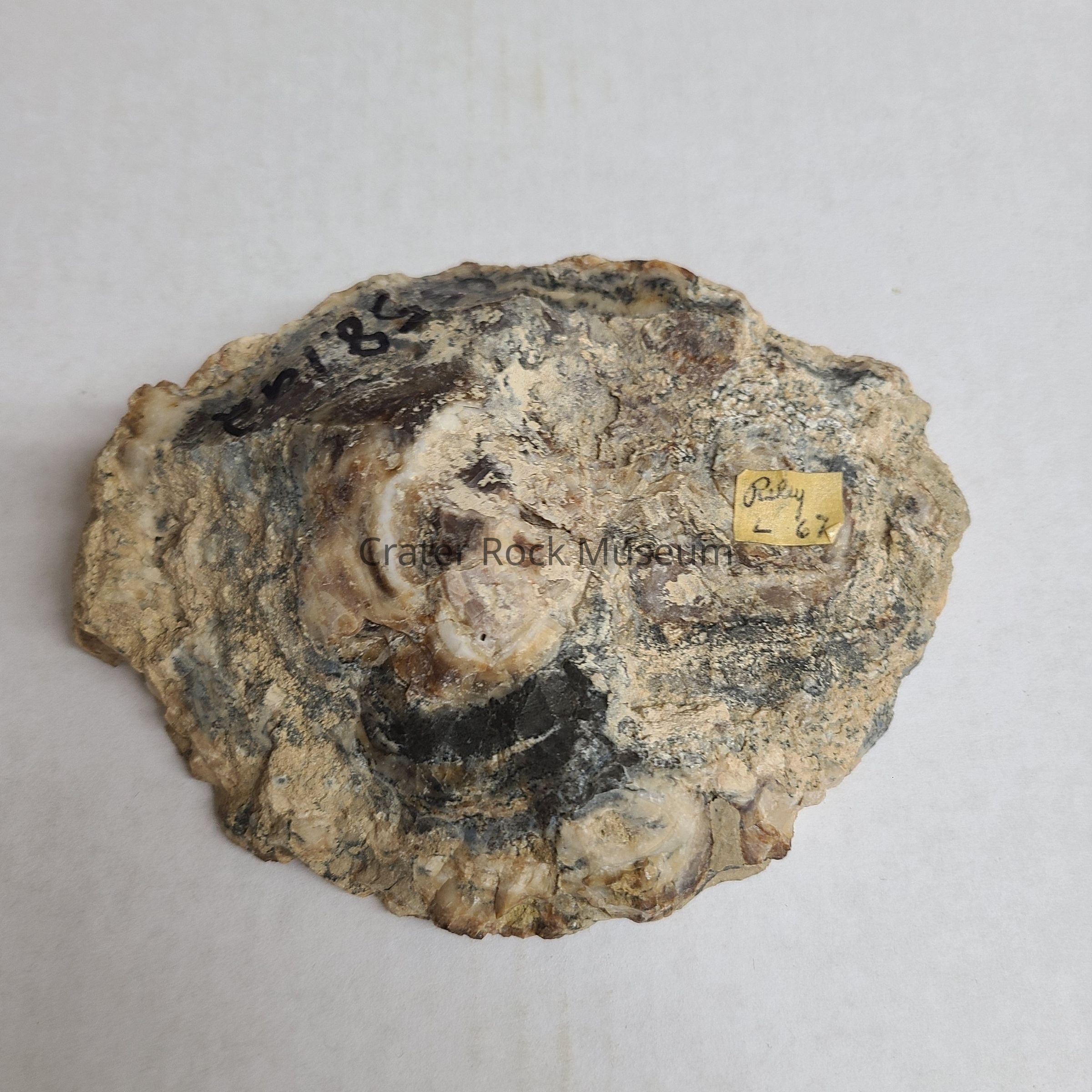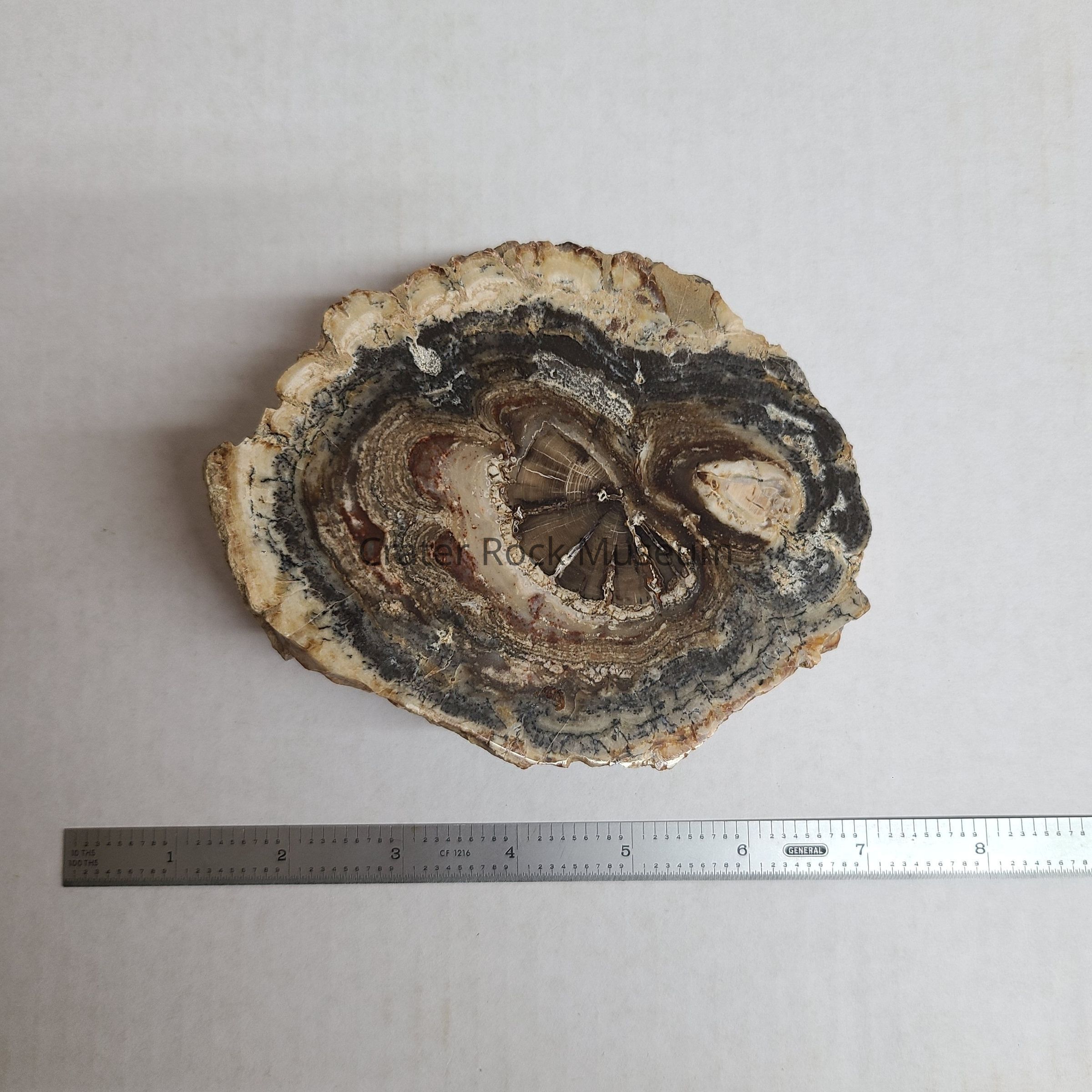Cut and polished round (approx 5.5"x4.5"x1 3/8"). Dendritic exterior with beige, brown, red, black, & greys rings.