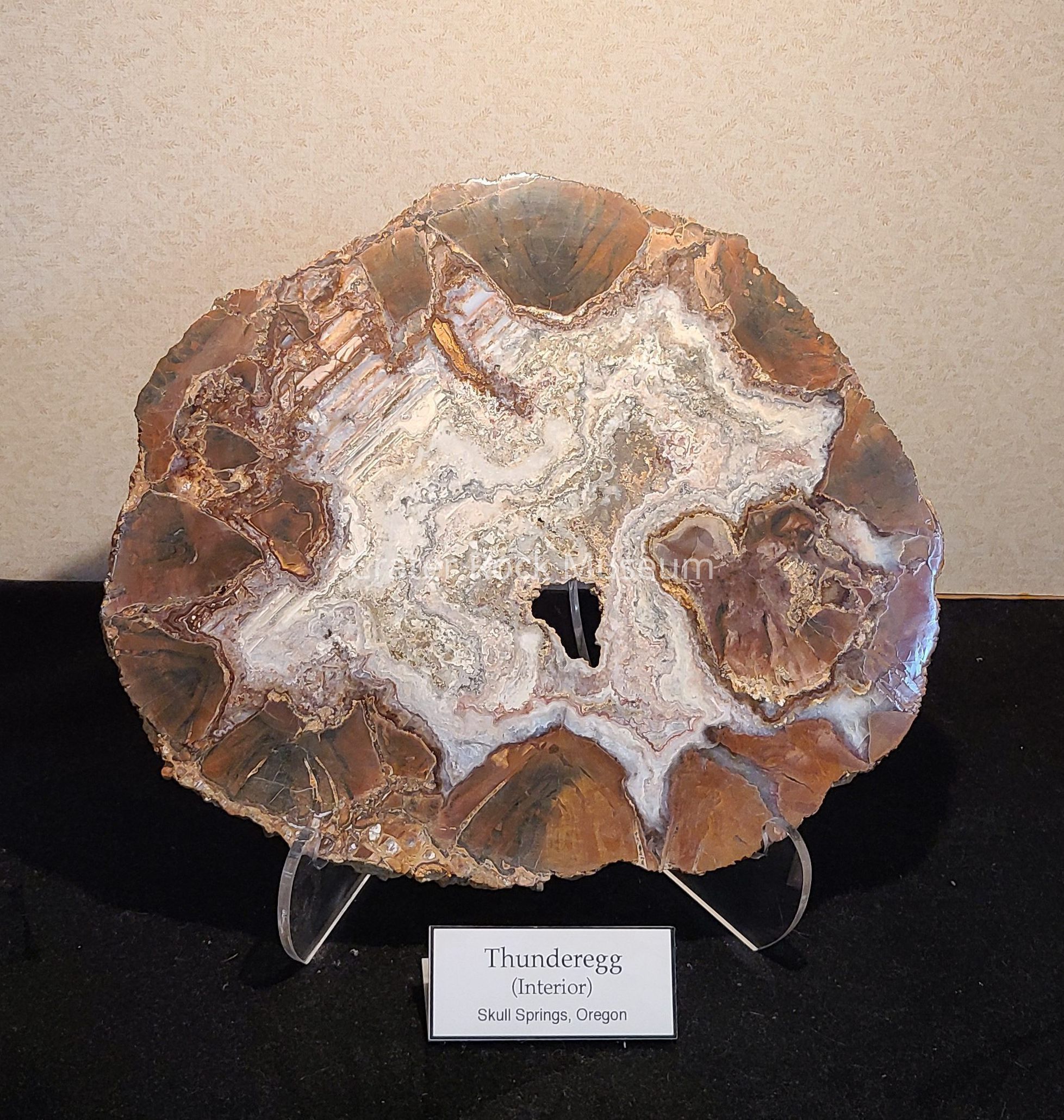 A 5/8" (1.6 cm) thick slice from a large Thunderegg from Skull Springs in Eastern OR. Back of piece is lacquered. Polished side shows an open hole in Star center surrounded by Paisley Design, Painted Agate in White, Greys, Pinks, Blues, Brick Reds with Brick Red, Brown and Black at outer edge. One side of Star center is bedded.Dimensions