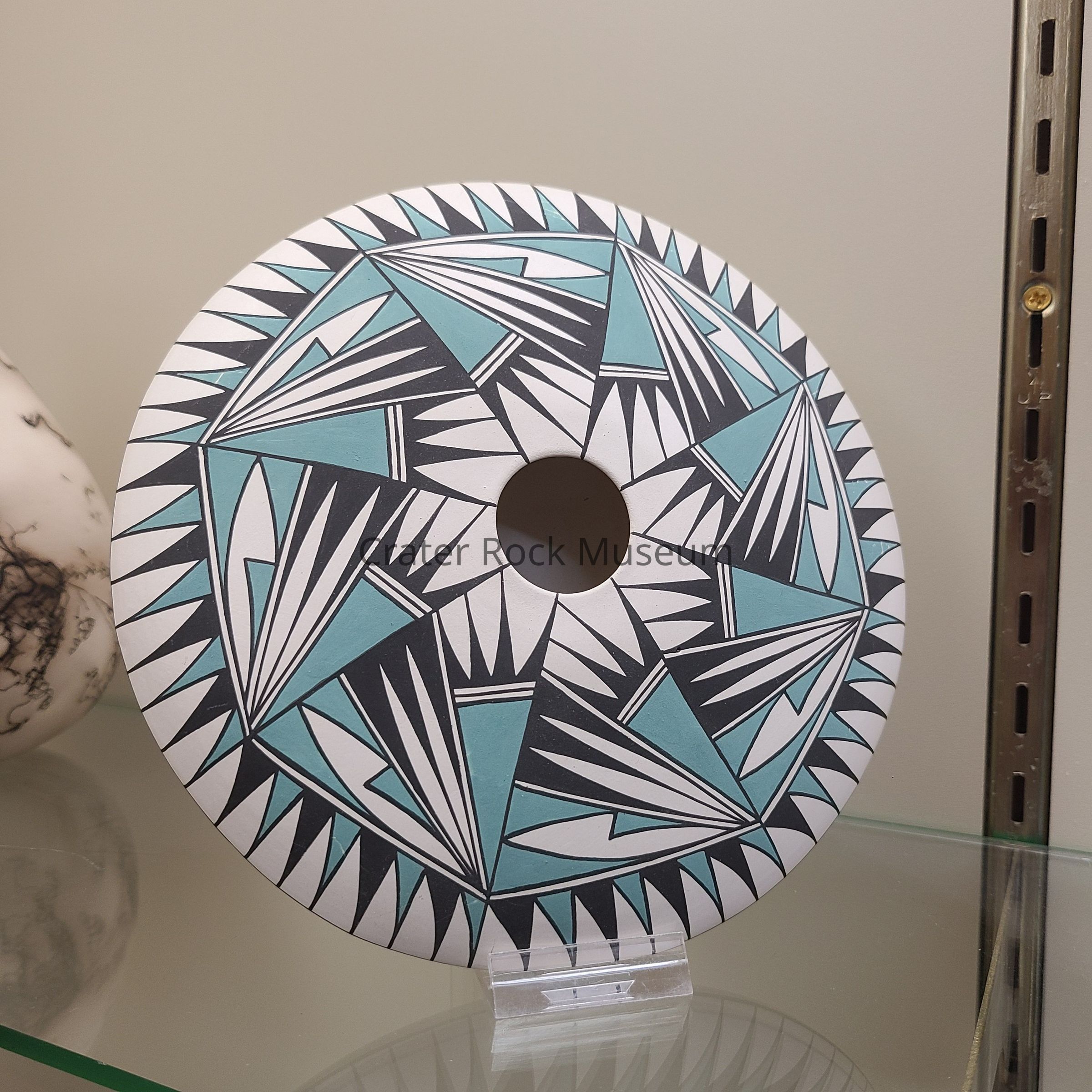 painted black and turquoise on white flattened seed pot