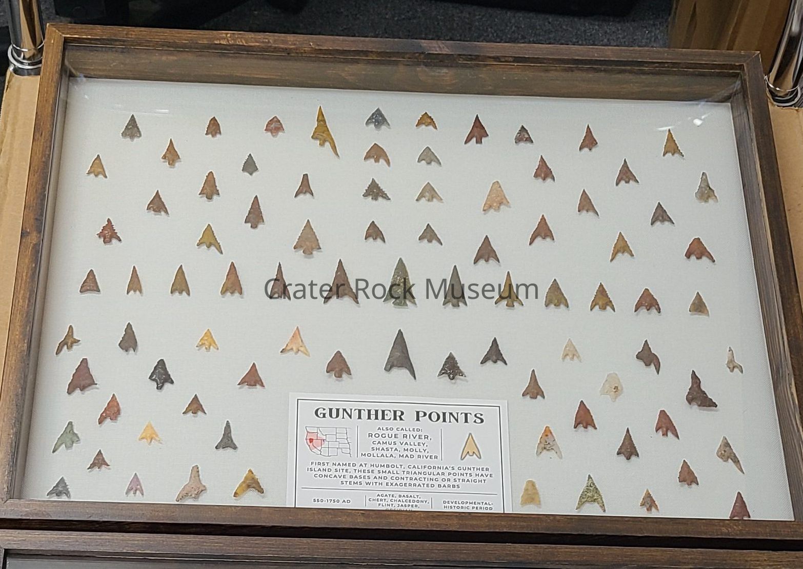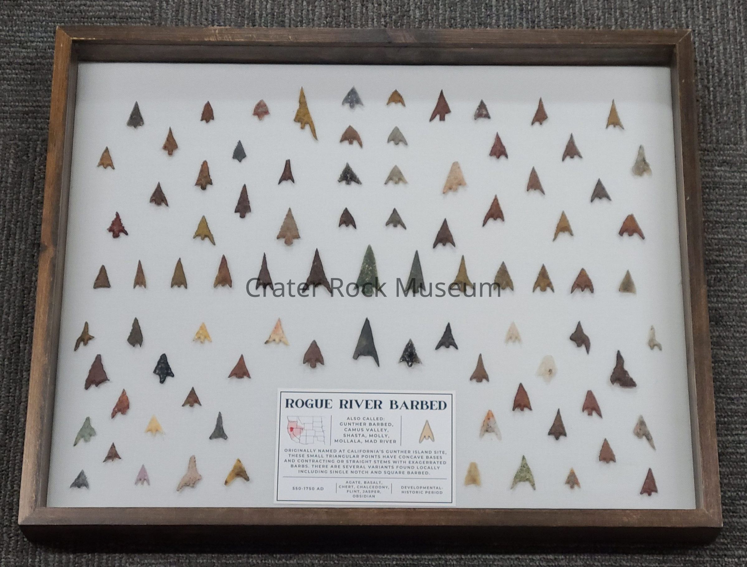 A collection of 85 projectile points in a shadow box representing the "rogue river barbed" form, assembled as part of the 2024 Oregon Heritage Grant
