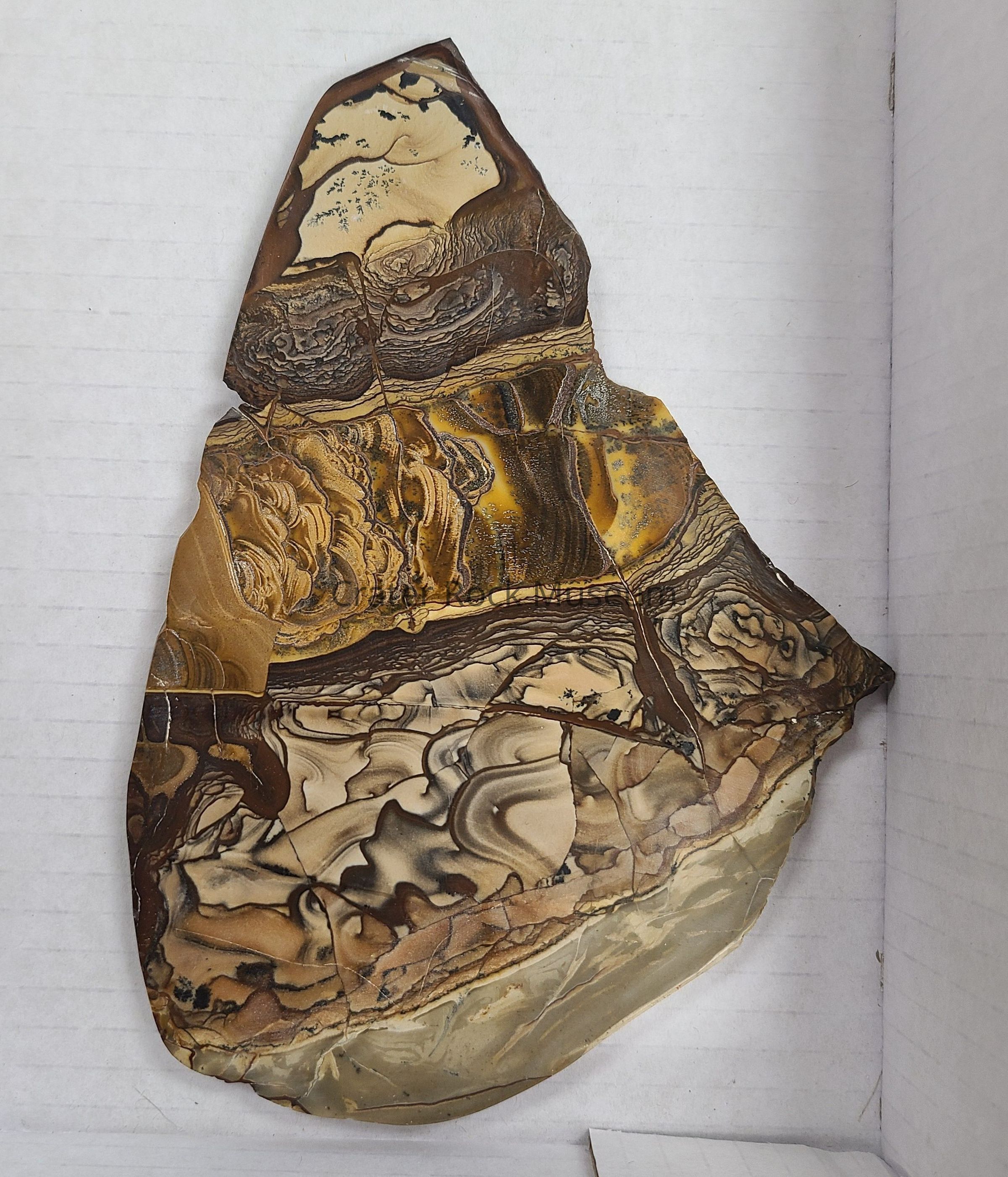 Large, roughly triangular shaped polished slab with dendrites