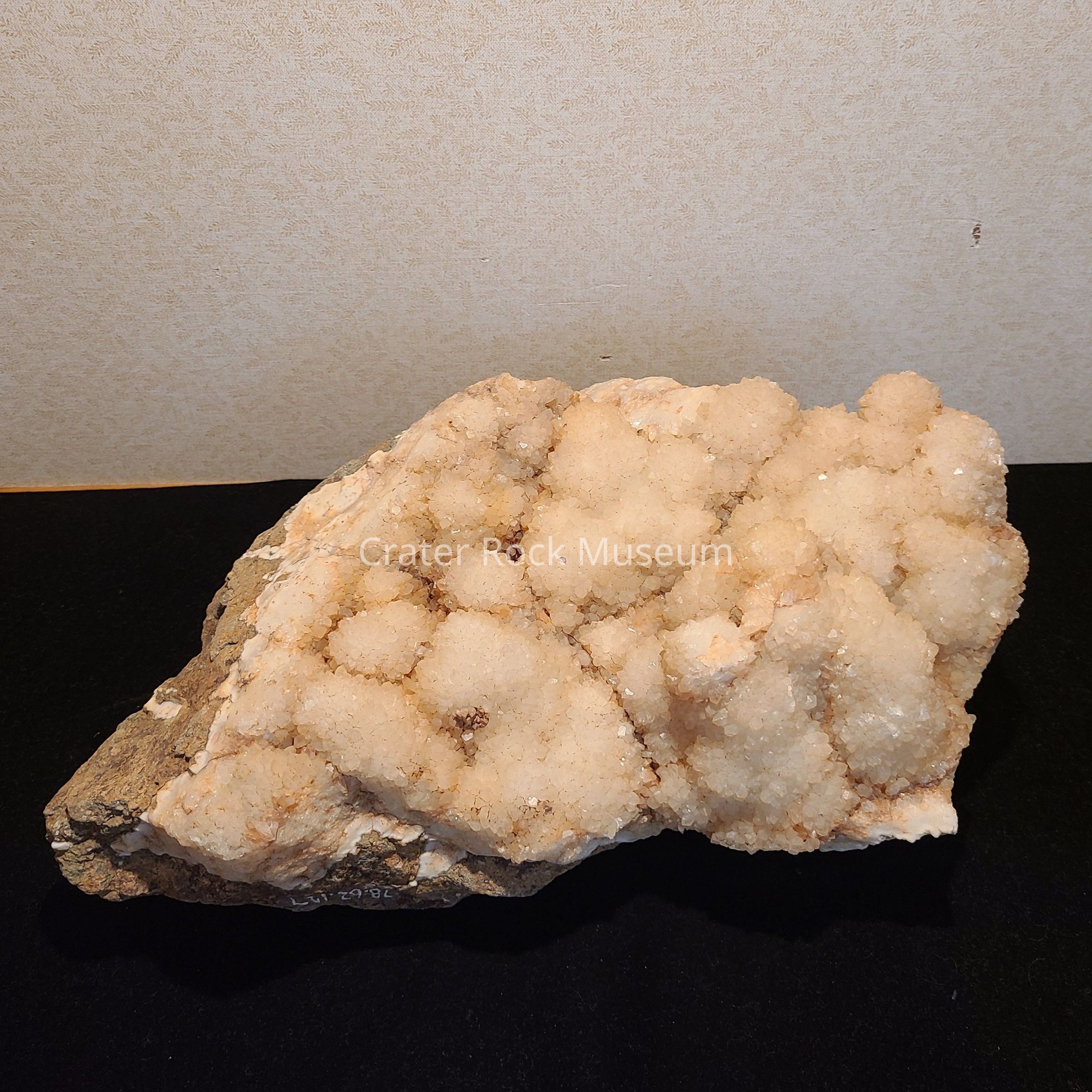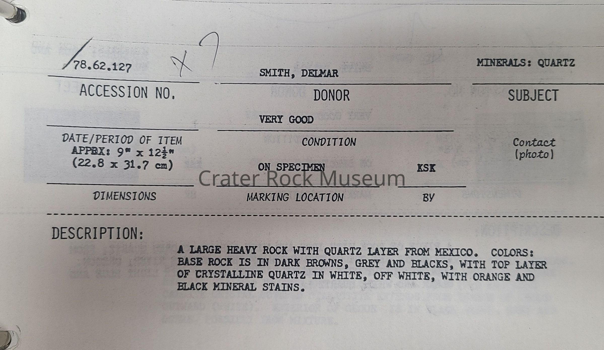 Delmar description: a large heavy rock with quartz layer from Mexico. Colors: base rock is in dark browns, grey, and blacks, with top layer of crystalline quartz in white, off white, with orange and black mineral stains.Location
