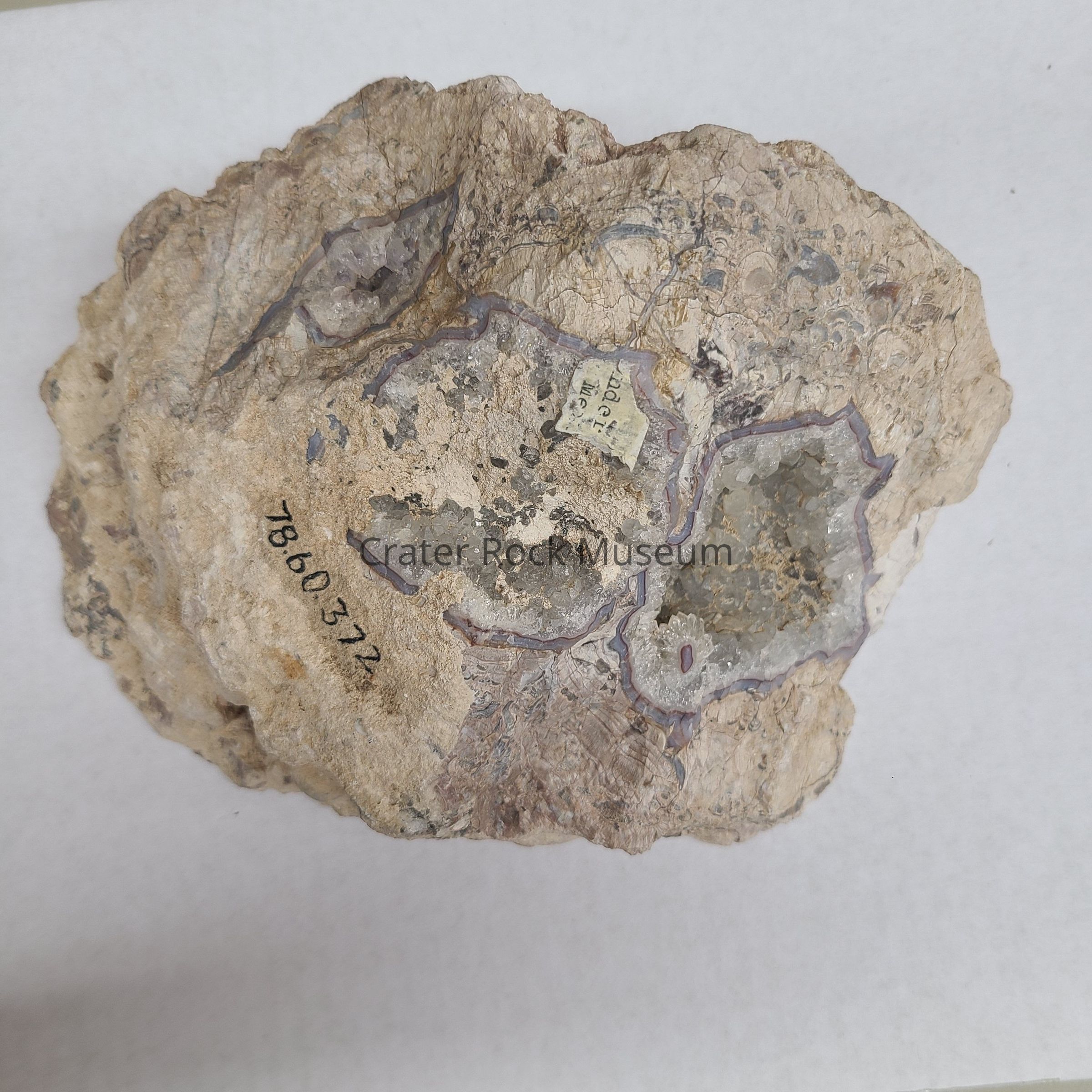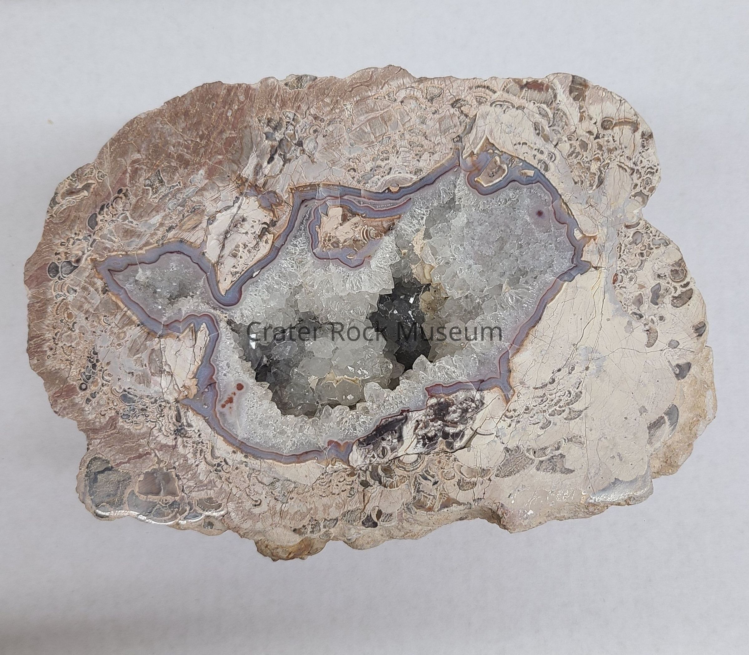 A Thunderegg from Deming, NM. Cut side shows open Crystalline outer (Pale Grey) surrounded by Blue Grey and Red Agate. Surrounding rock is in Pale Pinks and Greys. Numerous fractures seen.Dimensions