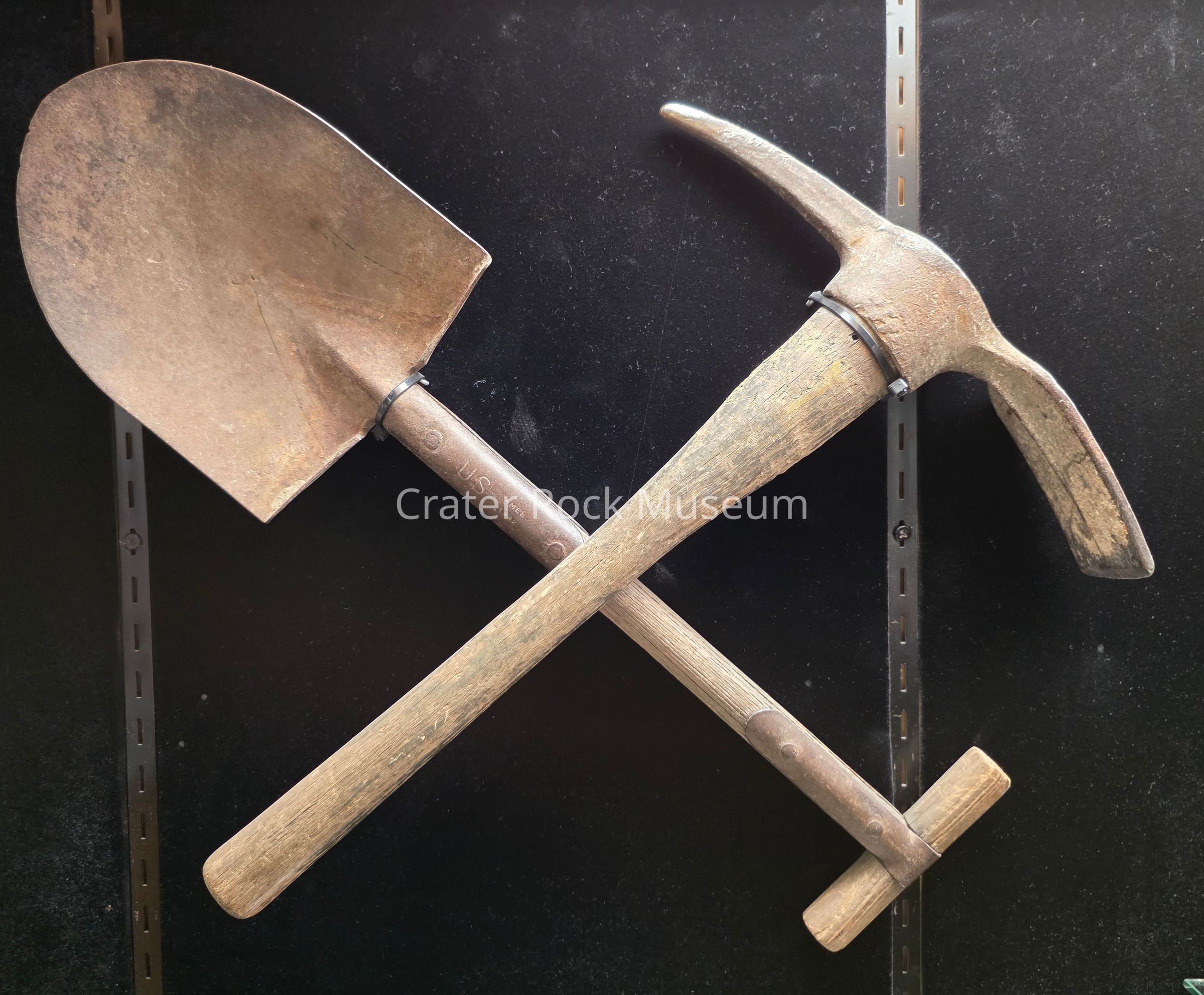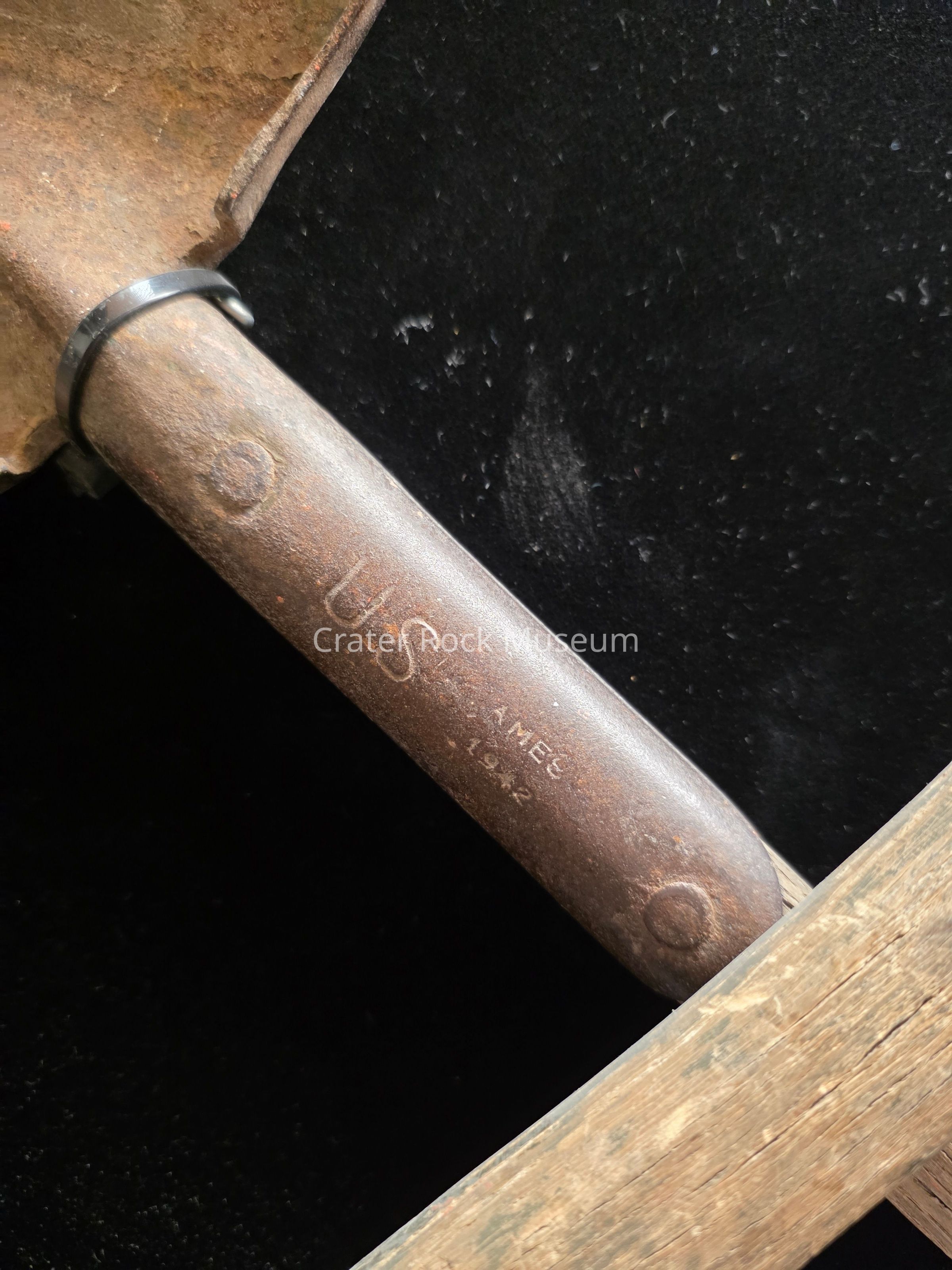 Rusted steel shovel head with a wooden T handle made by Ames circa 1942. Affixed with black zip ties to the back wall of mining case in conjunction with 2025.8.26, which overlays this piece.
